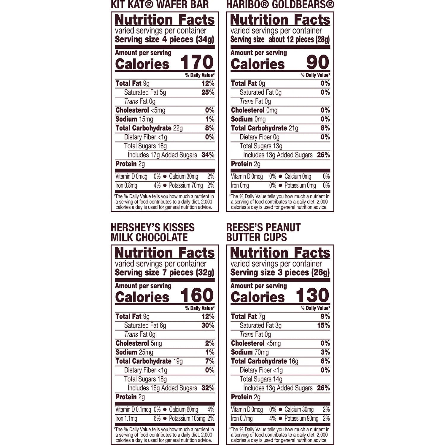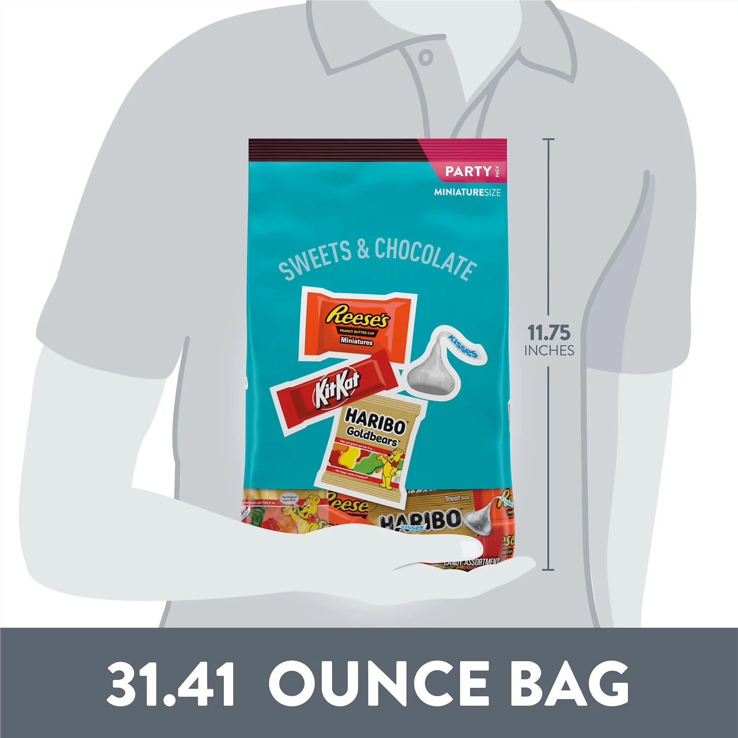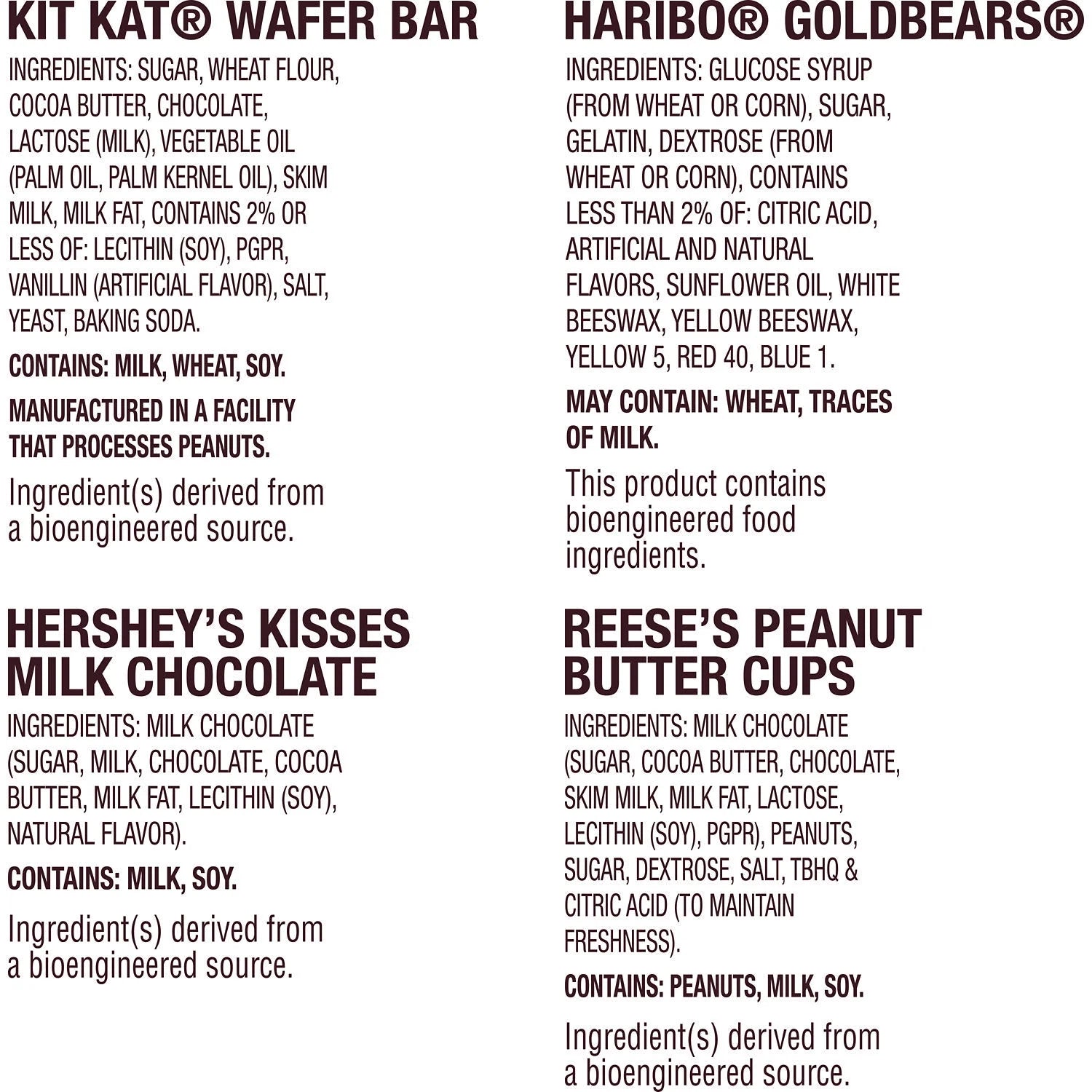 • Includes HERSHEY'S KISSES milk chocolate candy, REESE'S milk chocolate peanut butter cups, KIT KAT milk chocolate wafer bars and HARIBO GOLDBEARS gummy candy