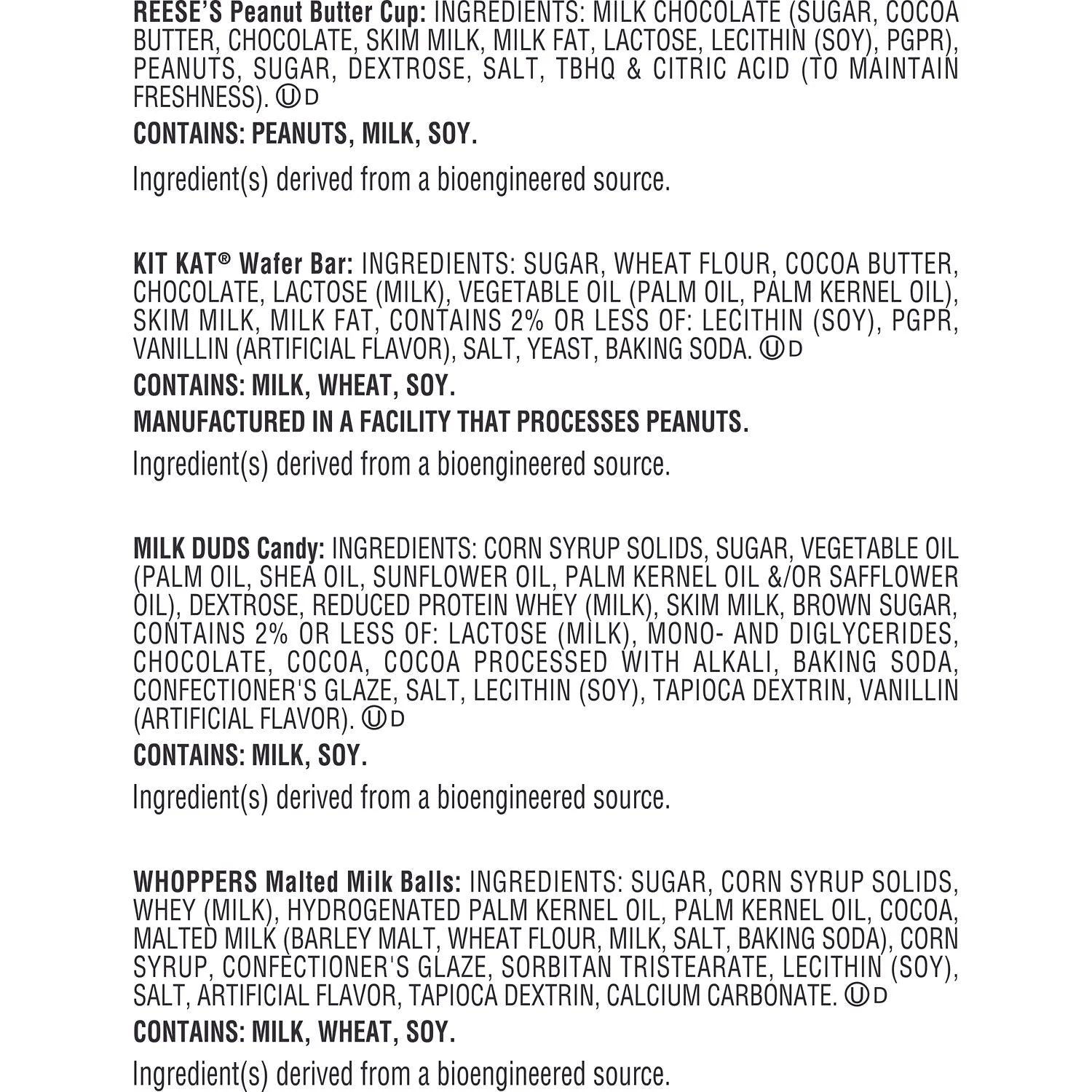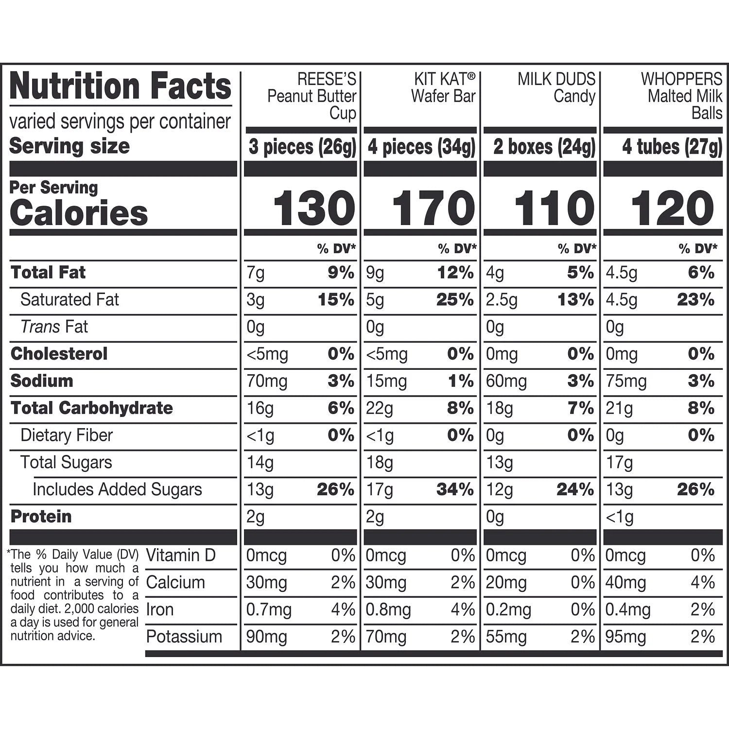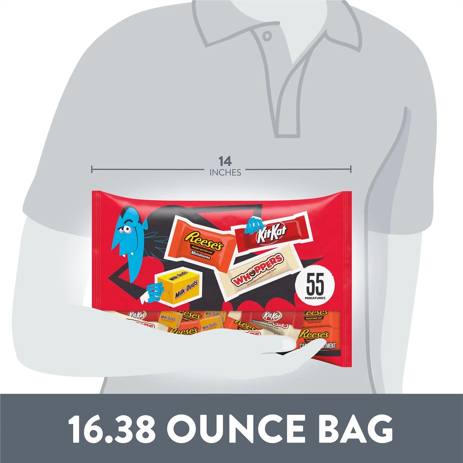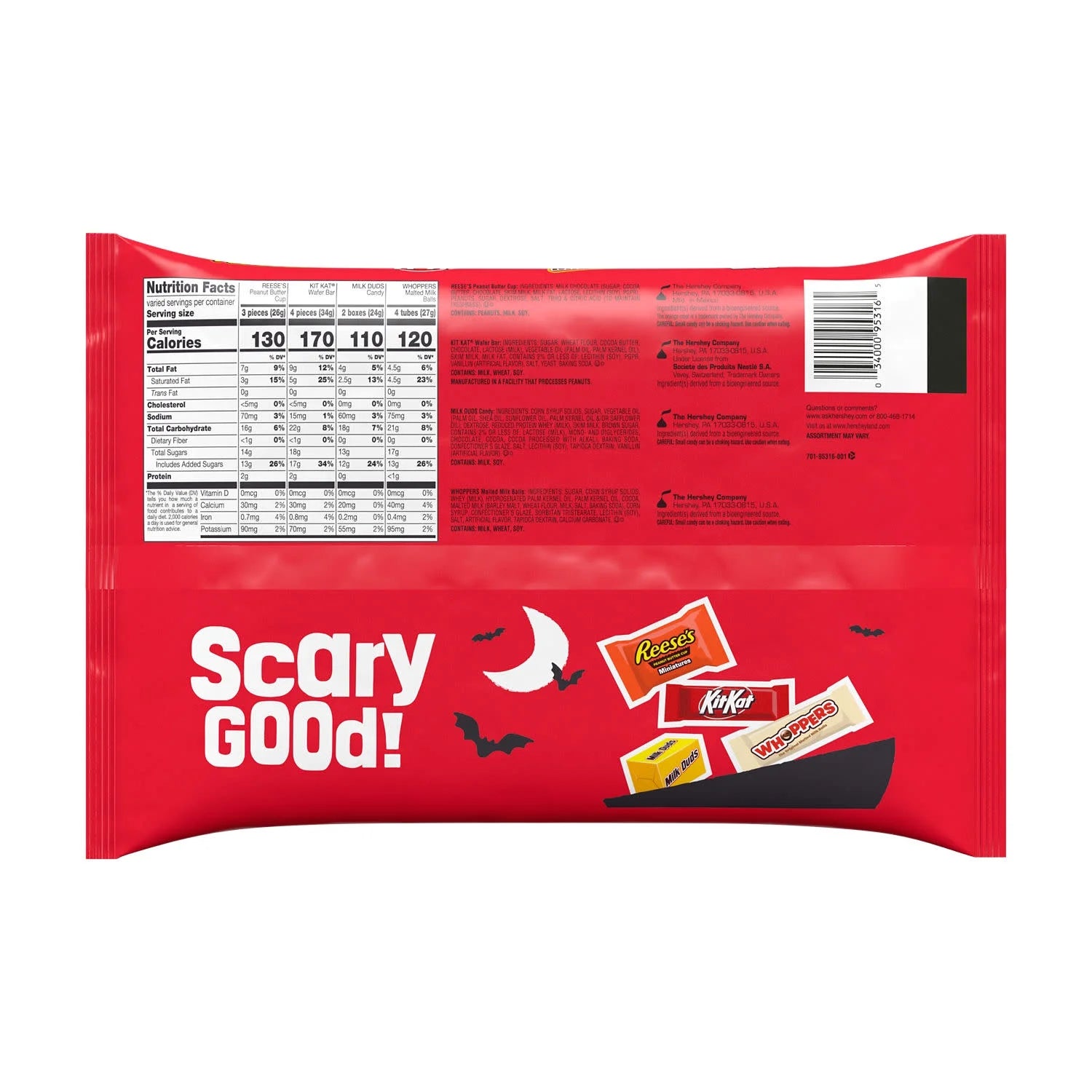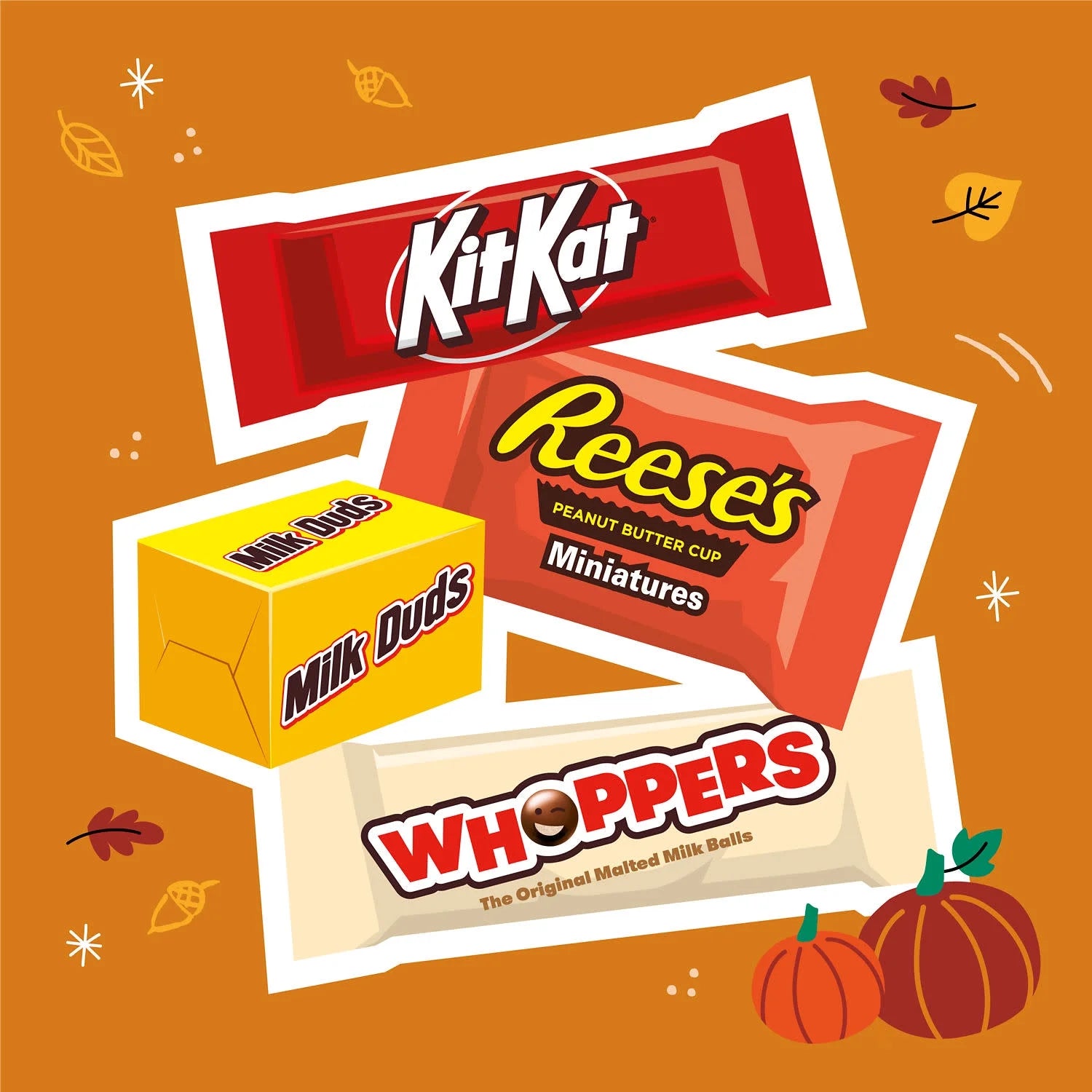 Enjoy a delicious treat anytime and anywhere with this Halloween candy variety bag. Offering four crowd pleasing favorites, this candy assortment is perfect for sharing with family, friends and Halloween night visitors. Take this bulk variety candy bag into the office break room, pour some individually wrapped candies into your jar at home or take a bag to your next costume party to make a lasting impression. Or, simply pass out pieces on trick or treat night or at your local trunk or treat event. This Hershey's variety bag includes REESE'S milk chocolate peanut butter cups candy, WHOPPERS malted milk balls candy, KIT KAT milk chocolate wafer candy bars, and MILK DUDS chewy caramel candy all in miniature size pieces.
