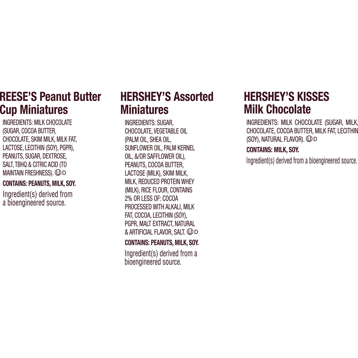 REESE'S PEANUT BUTTER CUP MINIATURES: MILK CHOCOLATE (SUGAR, COCOA BUTTER, CHOCOLATE, SKIM MILK, MILK FAT, LACTOSE, LECITHIN (SOY), PGPR), PEANUTS, SUGAR, DEXTROSE, SALT, TBHQ & CITRIC ACID (TO MAINTAIN FRESHNESS). HERSHEY'S ASSORTED MINIATURES: SUGAR, CHOCOLATE, VEGETABLE OIL (PALM OIL, SHEA OIL, SUNFLOWER OIL, PALM KERNEL OIL, &/OR SAFFLOWER OIL), PEANUTS, COCOA BUTTER, LACTOSE (MILK), SKIM MILK, MILK, REDUCED PROTEIN WHEY (MILK), RICE FLOUR, CONTAINS 2% OR LESS OF: COCOA PROCESSED WITH ALKALI, MILK FAT, COCOA, LECITHIN (SOY), PGPR, MALT EXTRACT, NATURAL & ARTIFICIAL FLAVOR, SALT. HERSHEY'S KISSES MILK CHOCOLATE: MILK CHOCOLATE (SUGAR, MILK, CHOCOLATE, COCOA BUTTER, MILK FAT, LECITHIN (SOY), NATURAL FLAVOR./div>