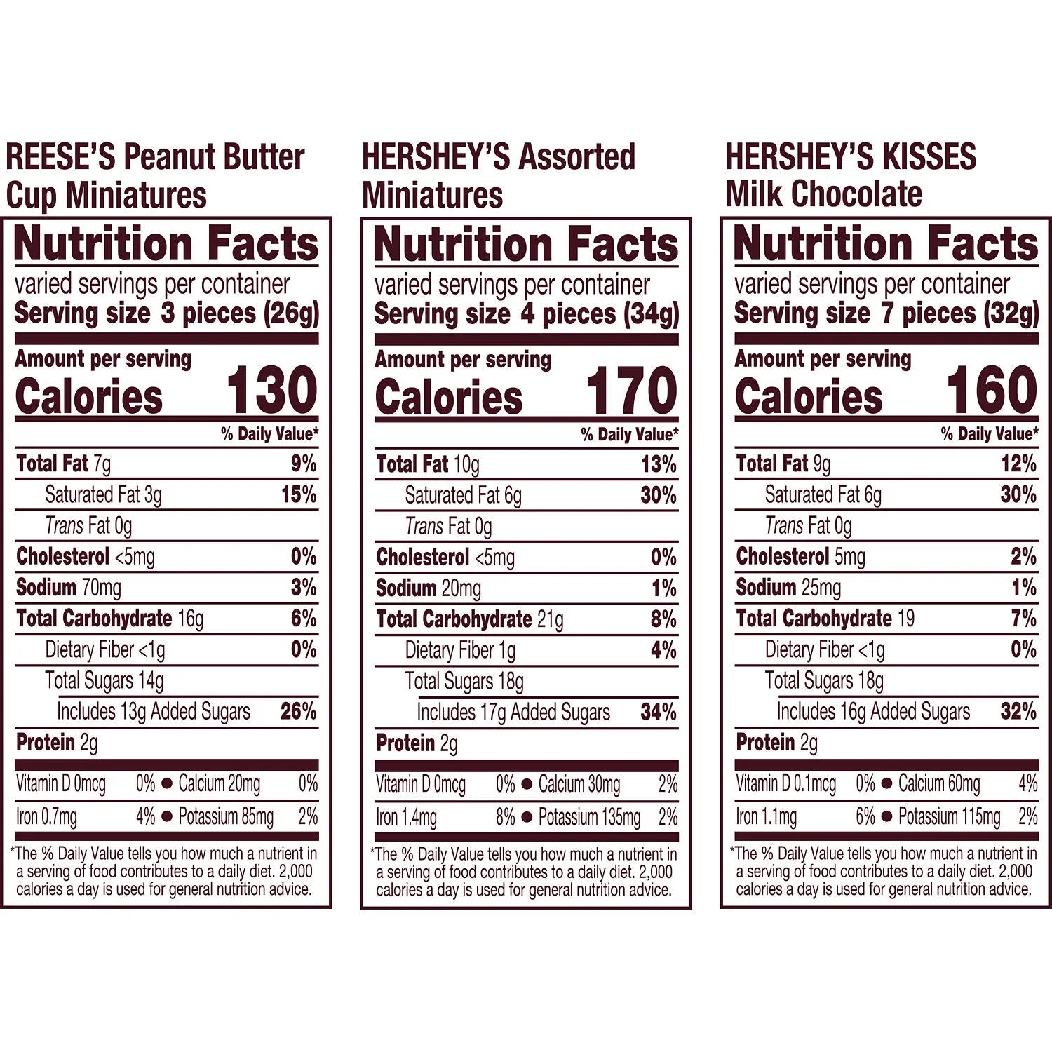 - Includes HERSHEY'S KISSES milk chocolate candy, REESE'S Miniatures milk chocolate peanut butter cups and HERSHEY'S Miniatures assorted chocolate candy