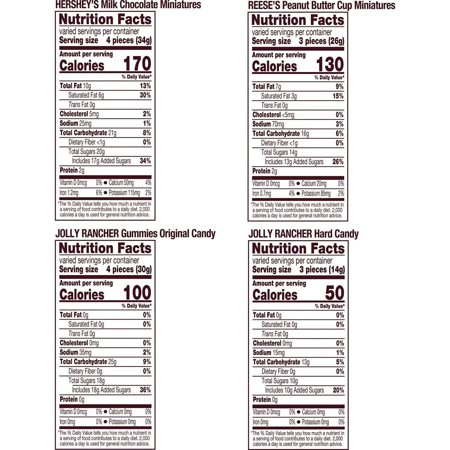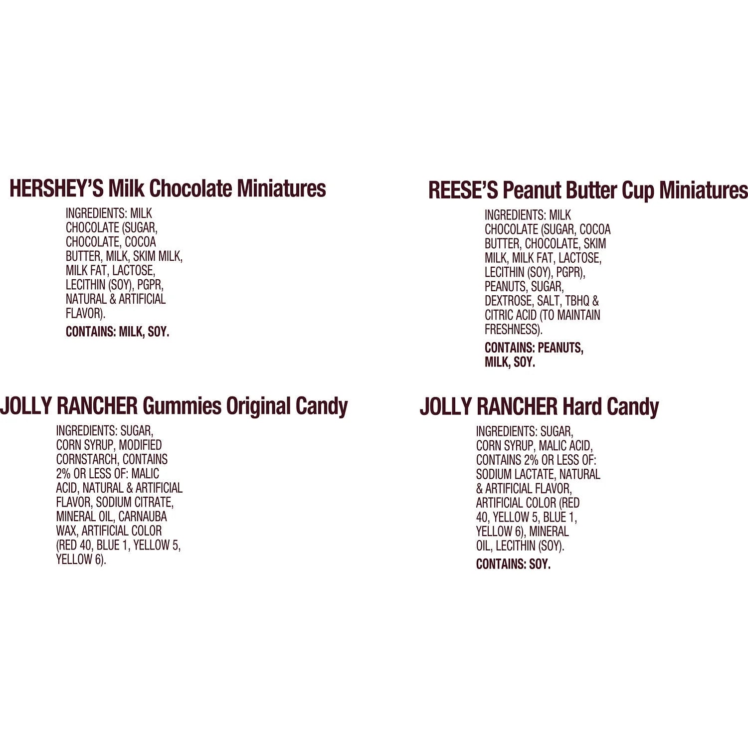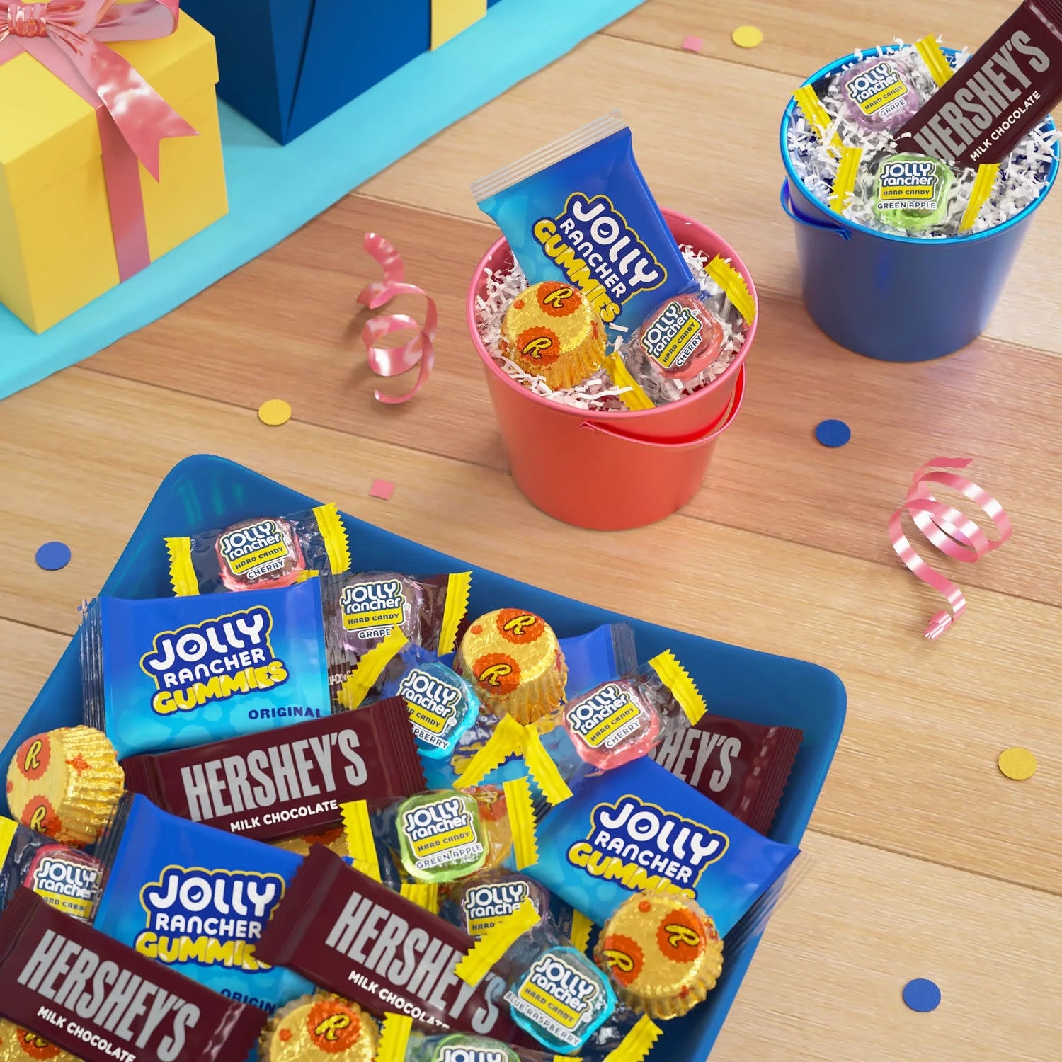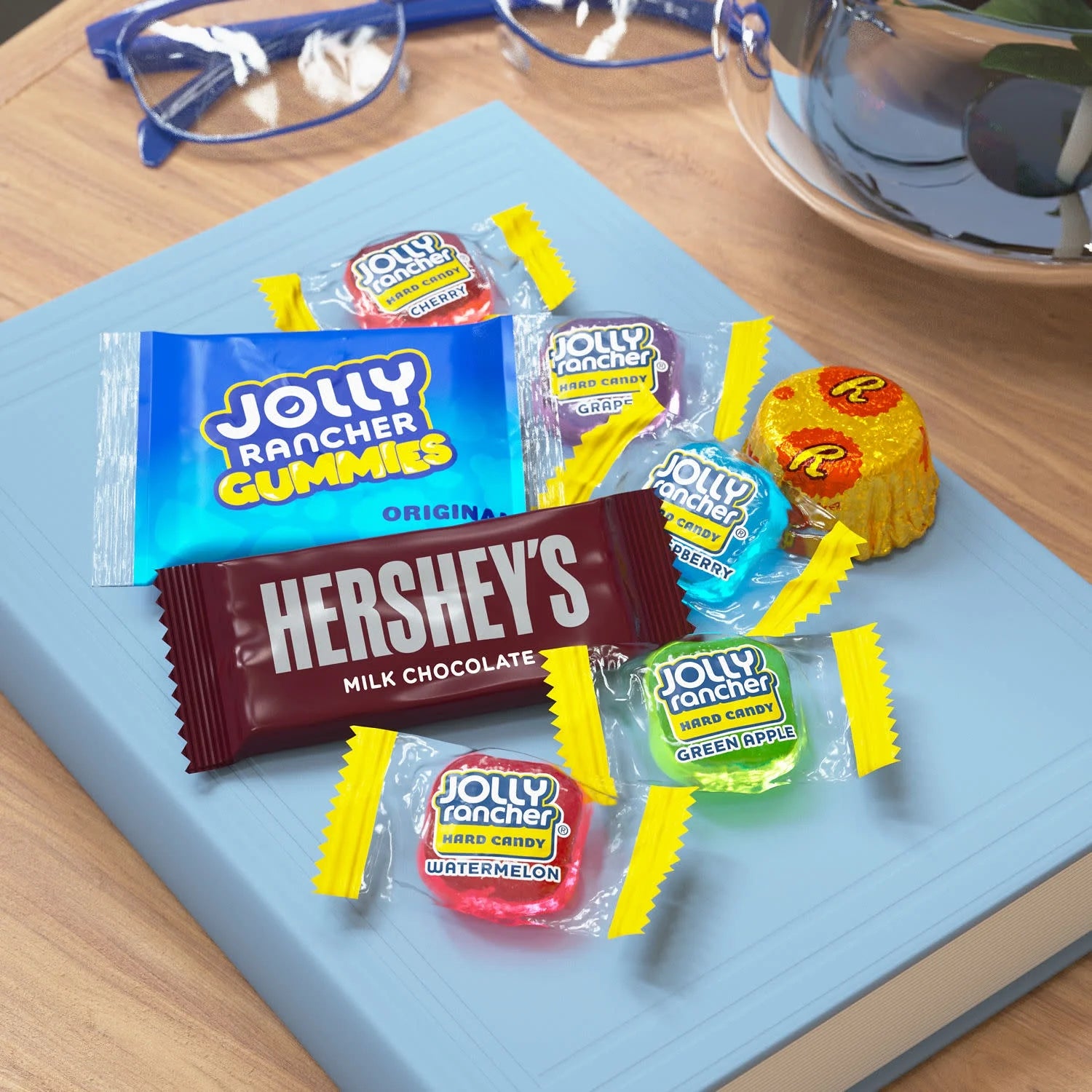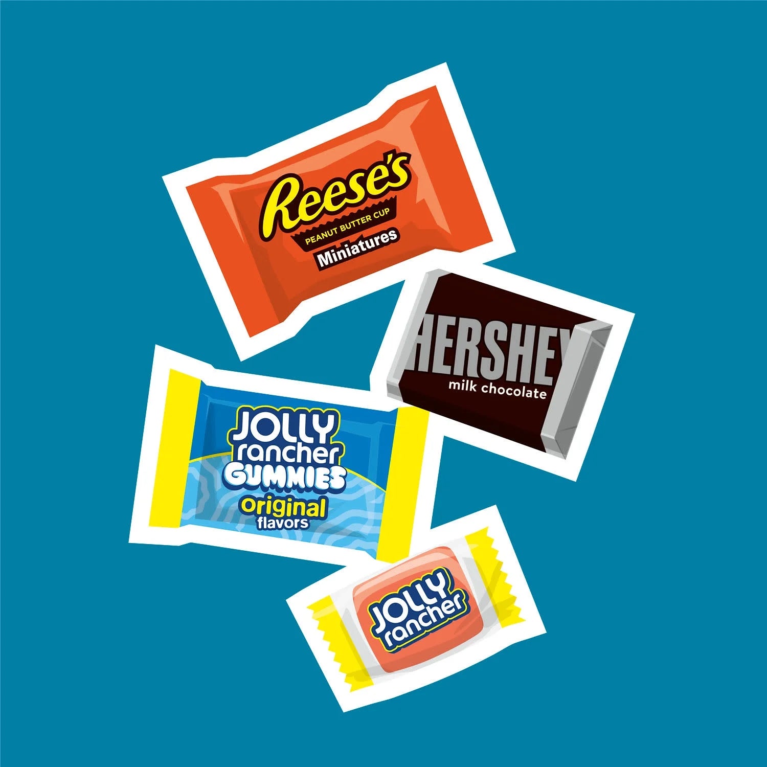 • Includes HERSHEY'S milk chocolate candy bars, JOLLY RANCHER gummies candy, JOLLY RANCHER hard candy, and REESE'S milk chocolate peanut butter cups candy
