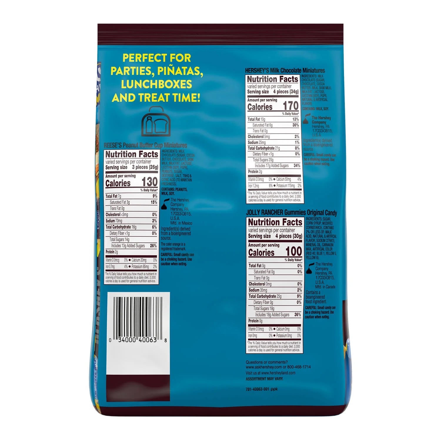 Enjoy a delicious treat anywhere and anytime with this HERSHEY'S, JOLLY RANCHER and REESE'S assorted candy, perfect for everyday enjoyment. Offering a variety of crowd pleasing favorites, this candy assortment is perfect for sharing with anyone! Take this party pack bag into the office break room, pour some individually wrapped candies into your jar at home or take a bag to your next sports game to celebrate the win. This assorted bag of candy includes HERSHEY'S milk chocolate candy bars, JOLLY RANCHER gummies candy, JOLLY RANCHER hard candy, and REESE'S milk chocolate peanut butter cups candy