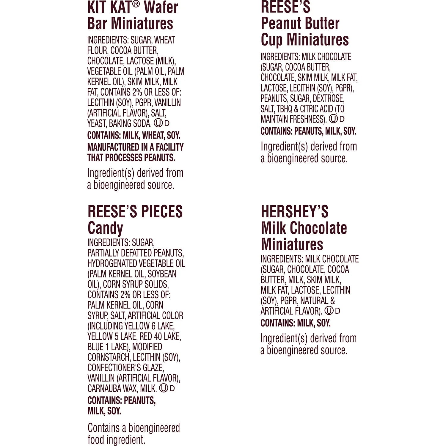 KIT KAT® Wafer Bar Miniatures INGREDIENTS: SUGAR, WHEAT FLOUR, COCOA BUTTER, CHOCOLATE, LACTOSE (MILK), VEGETABLE OIL (PALM OIL, PALM KERNEL OIL), SKIM MILK, MILK FAT, CONTAINS 2% OR LESS OF: LECITHIN (SOY), PGPR, VANILLIN (ARTIFICIAL FLAVOR), SALT, YEAST, BAKING SODA. UD CONTAINS: MILK, WHEAT, SOY. MANUFACTURED IN A FACILITY THAT PROCESSES PEANUTS. Ingredient(s) derived from a bioengineered source. REESE'S PIECES Candy INGREDIENTS: SUGAR, PARTIALLY DEFATTED PEANUTS, HYDROGENATED VEGETABLE OIL (PALM KERNEL OIL, SOYBEAN OIL), CORN SYRUP SOLIDS, CONTAINS 2% OR LESS OF: PALM KERNEL OIL, CORN SYRUP, SALT, ARTIFICIAL COLOR (INCLUDING YELLOW 6 LAKE, YELLOW 5 LAKE, RED 40 LAKE, BLUE 1 LAKE), MODIFIED CORNSTARCH, LECITHIN (SOY), CONFECTIONER'S GLAZE, VANILLIN (ARTIFICIAL FLAVOR), CARNAUBA WAX, MILK. UD CONTAINS: PEANUTS, MILK, SOY. Contains a bioengineered REESE'S Peanut Butter Cup Miniatures INGREDIENTS: MILK CHOCOLATE (SUGAR, COCOA BUTTER, CHOCOLATE, SKIM MILK, MILK FAT, LACTOSE, LECITHIN (SOY), PGPR), PEANUTS, SUGAR, DEXTROSE, SALT, TBHQ & CITRIC ACID (TO MAINTAIN FRESHNESS). UD CONTAINS: PEANUTS, MILK, SOY. Ingredient(s) derived from a bioengineered source. HERSHEY'S Milk Chocolate Miniatures INGREDIENTS: MILK CHOCOLATE (SUGAR, CHOCOLATE, COCOA BUTTER, MILK, SKIM MILK, MILK FAT, LACTOSE, LECITHIN (SOY), PGPR, NATURAL & ARTIFICIAL FLAVOR). D CONTAINS: MILK, SOY. Ingredient(s) derived from a bioengineered source./div>