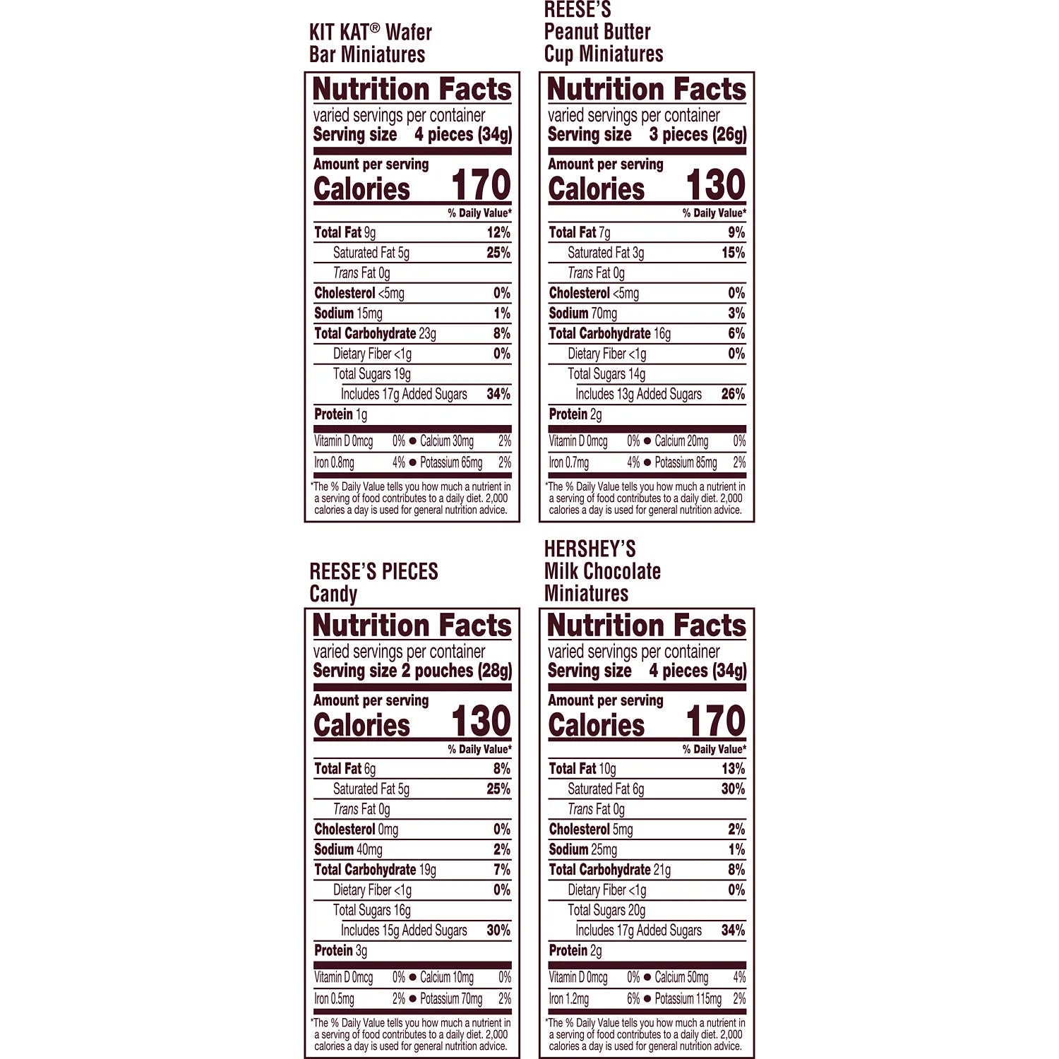 - Includes HERSHEY'S milk chocolate candy bars, KIT KAT® milk chocolate wafer candy bars, REESE'S Miniatures milk chocolate peanut butter cups candy and REESE'S PIECES peanut butter candy