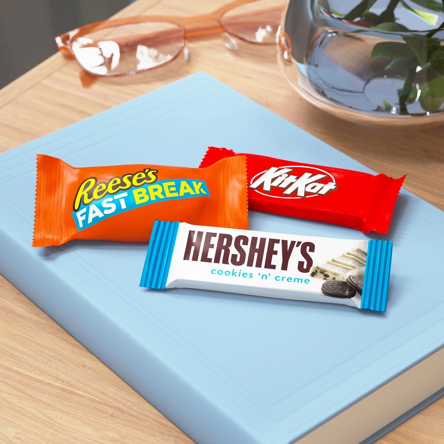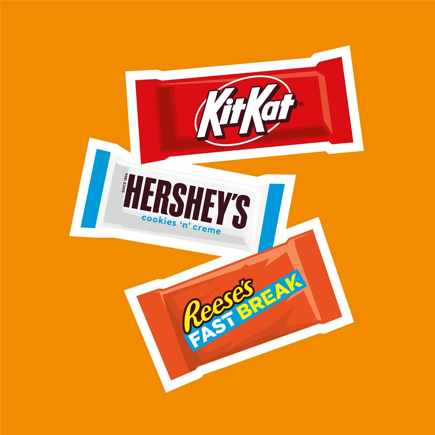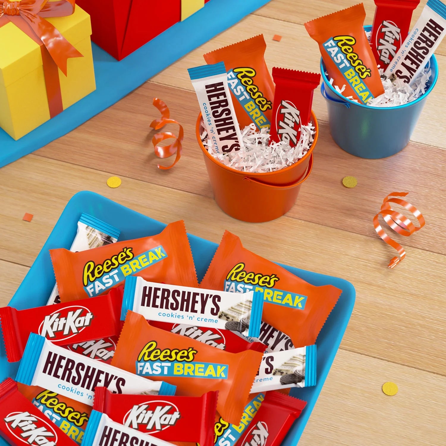 • Includes REESE'S FAST BREAK peanut butter nougat candy bars, HERSHEY'S Cookies 'n' Creme candy bars and KIT KAT® milk chocolate wafer bars