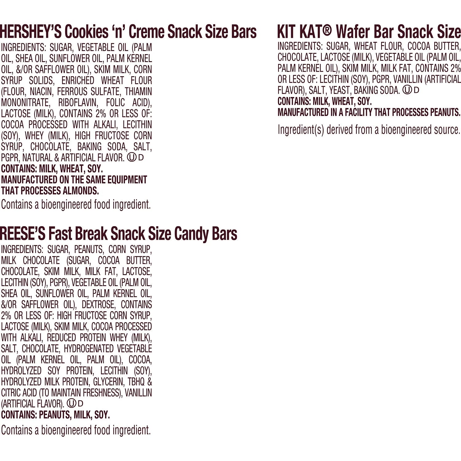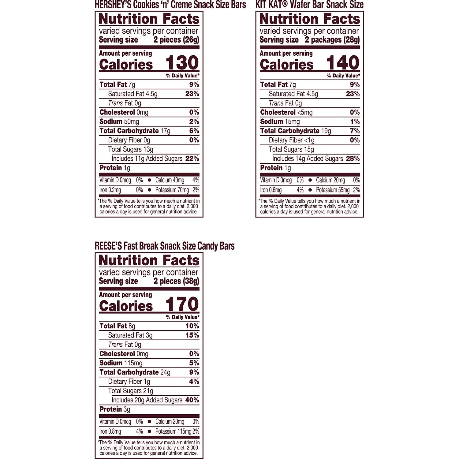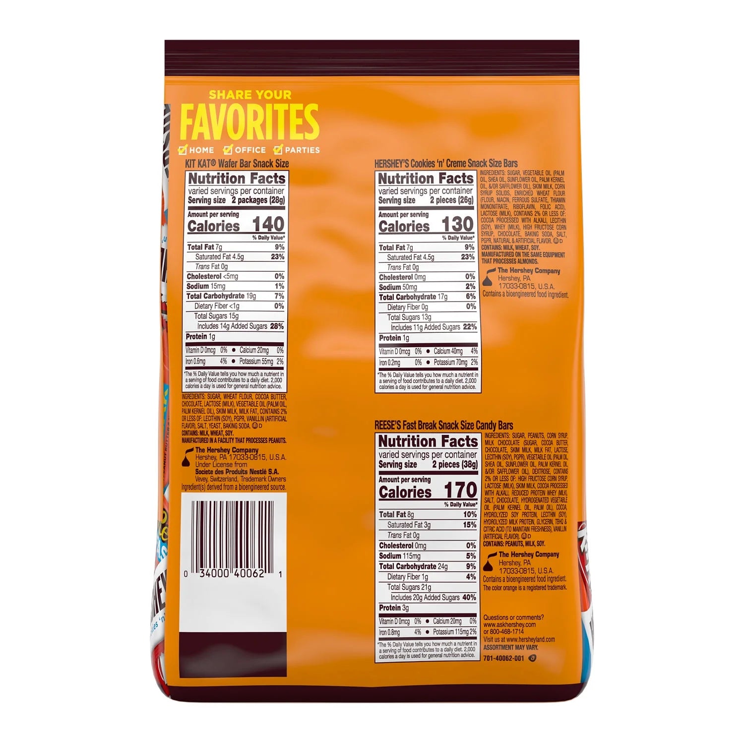• Includes REESE'S FAST BREAK peanut butter nougat candy bars, HERSHEY'S Cookies 'n' Creme candy bars and KIT KAT® milk chocolate wafer bars