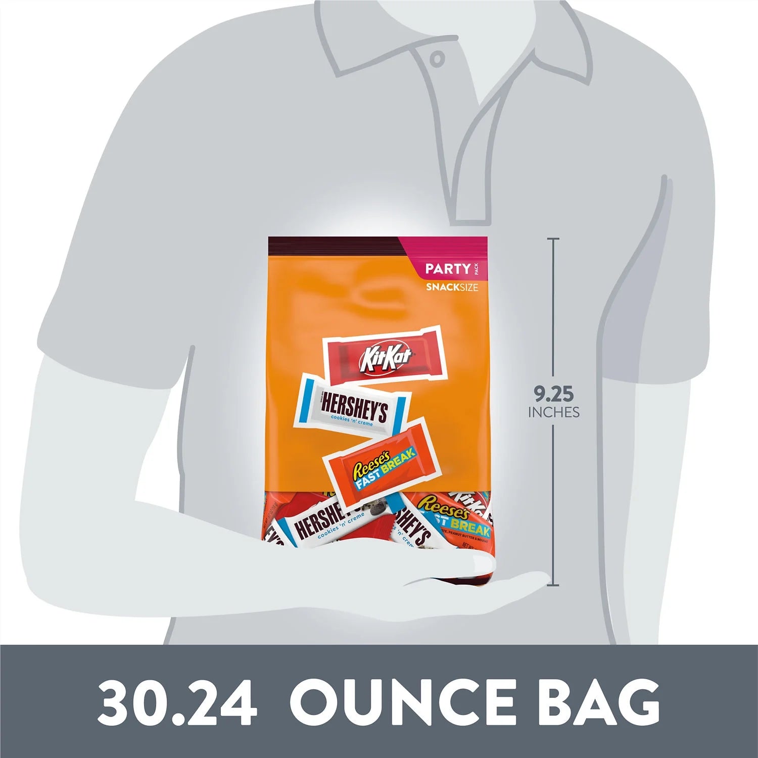 Enjoy a delicious candy treat any time with HERSHEY'S, KIT KAT® and REESE'S assorted flavored candy, perfect for celebrating the biggest holidays and all of the ordinary moments in between. Offering three crowd pleasing favorites, this candy assortment is perfect for sharing with family, friends, teammates or co-workers. Take this bulk candy bag into the office break room, pour individually wrapped candies into your jar at home or take a bag to your next sports game to celebrate the big win. This assorted bulk party pack of candies contains REESE'S FAST BREAK peanut butter nougat candy bars, HERSHEY'S Cookies 'n' Creme candy bars and KIT KAT® milk chocolate wafer bars — all in snack size bars. Hershey assorted flavored candy bars are also great for adding to parties, holidays, lunch boxes, desserts, picnics, tailgate parties and more. You really can't go wrong when you have a party page bag filled with assorted flavored snack size candy bars on hand. Add these snack size candy bars to your holiday festivities, too! Stuff Christmas stockings, fill Easter baskets and plastic eggs, stock Halloween candy bowls and create Valentine's Day gift bags for everyone you love. There's something for everyone in this delicious bulk candy assortment.
