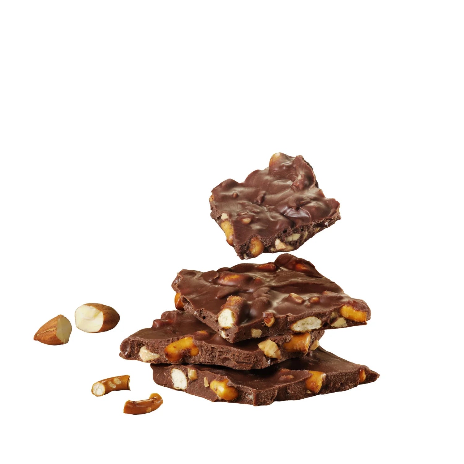 Sweet, crunchy, salty, nutty and oh so delicious? You can have it all when you bite into HERSHEY'S milk chocolate, almond and salted pretzel bark. This delectable treat is perfect for enjoying after a meal or simply for snacking on throughout the day. Each resealable bag contains creamy kosher milk chocolate pieces filled with almonds and salted pretzels for the perfect mix of sweet, salty and crunchy. HERSHEY'S milk chocolate bark is a simple and delicious treat any time of day – but just be warned, once they hear you take a bite, everyone around you will be begging you to share. Stock the pantry, your desk drawer and your backpack with HERSHEY'S bark so you always have the perfect snack when the moment strikes. You can even experiment with this crunchy treat in the kitchen by topping cakes and cupcakes with pieces of HERSHEY'S bark. Or, crumble this bark into smaller pieces and mix it in with your other favorite treats for a trail mix you can't resist.