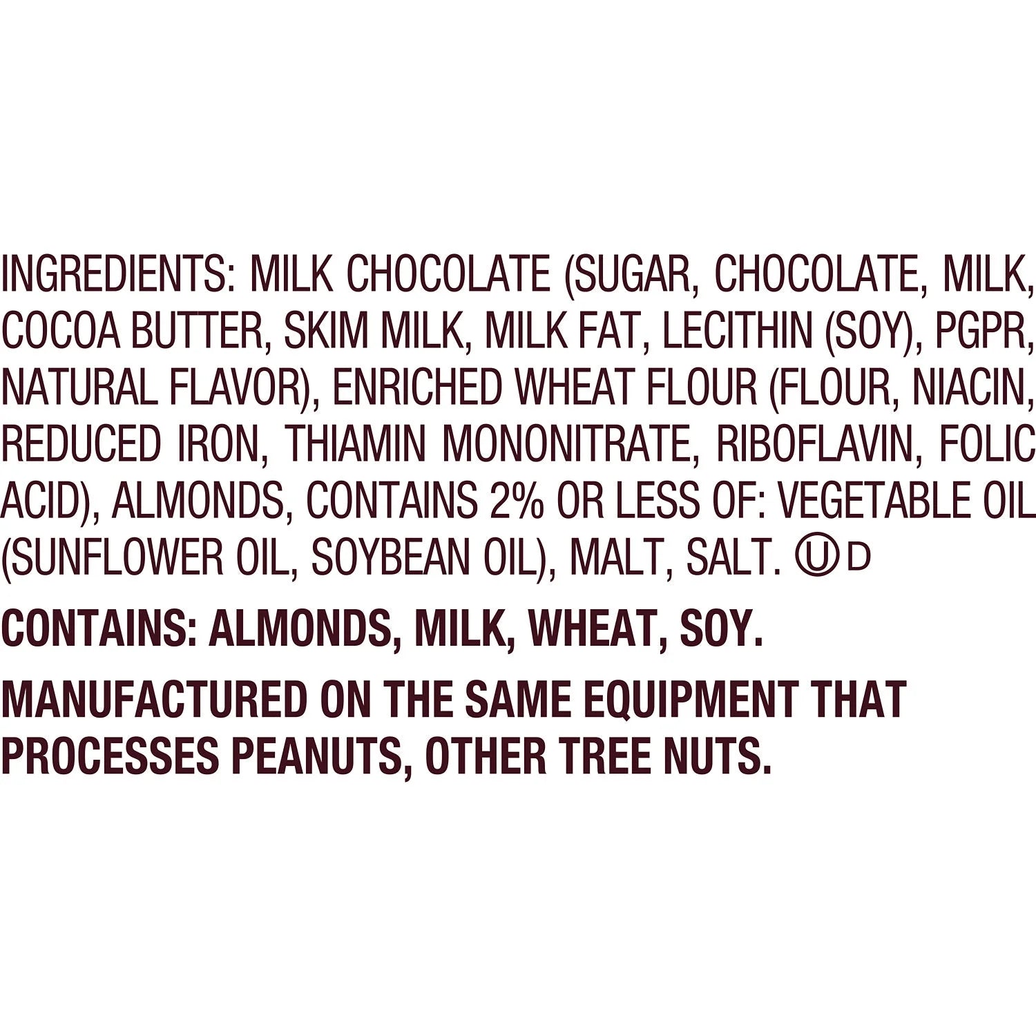 MILK CHOCOLATE (SUGAR, CHOCOLATE, MILK, COCOA BUTTER, SKIM MILK, MILK FAT, LECITHIN (SOY), PGPR, NATURAL FLAVOR), ENRICHED WHEAT FLOUR (FLOUR, NIACIN, REDUCED IRON, THIAMIN MONONITRATE, RIBOFLAVIN, FOLIC ACID), ALMONDS, CONTAINS 2% OR LESS OF: VEGETABLE OIL (SUNFLOWER OIL, SOYBEAN OIL), MALT, SALT./div>