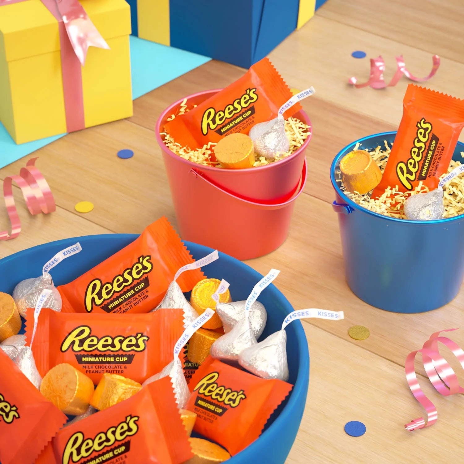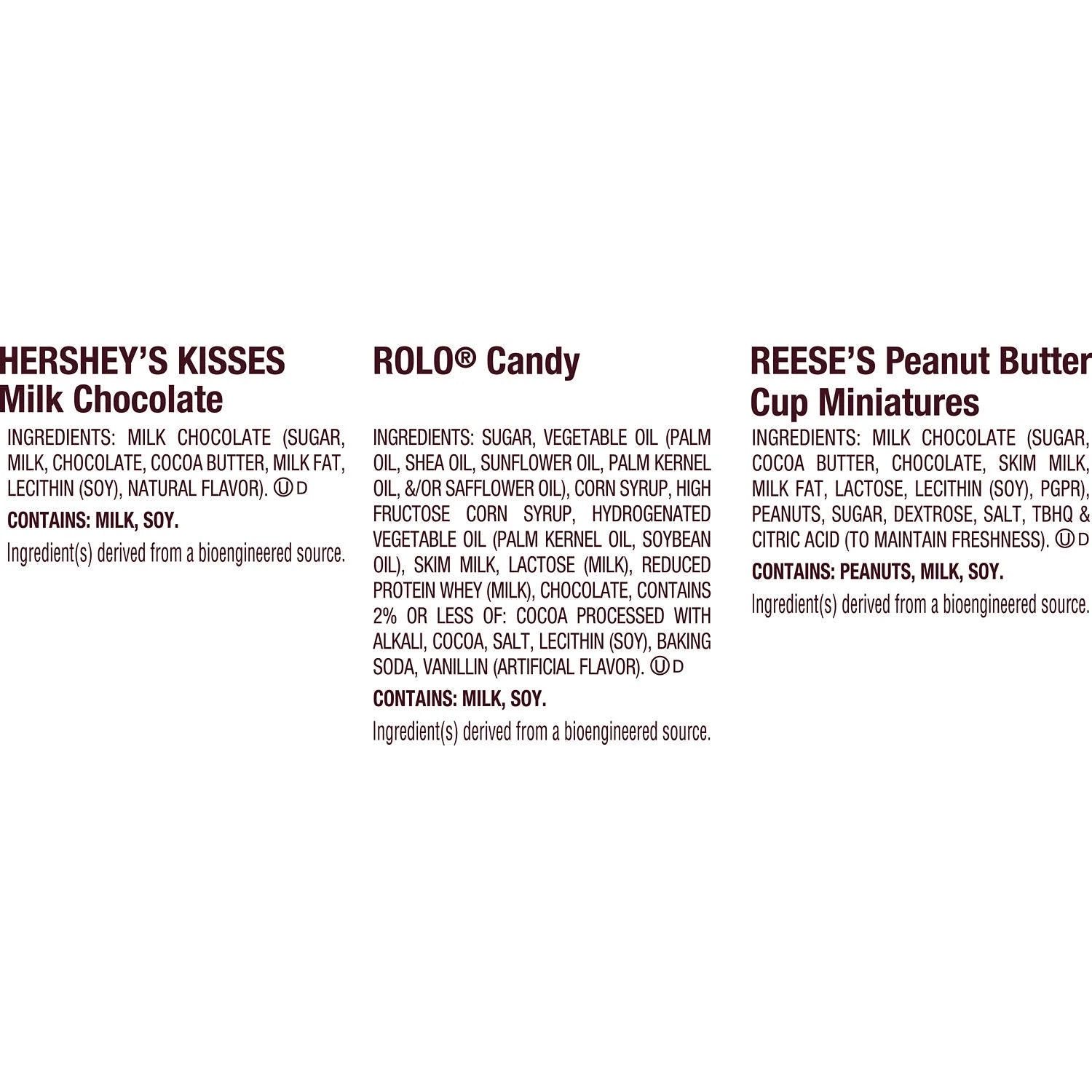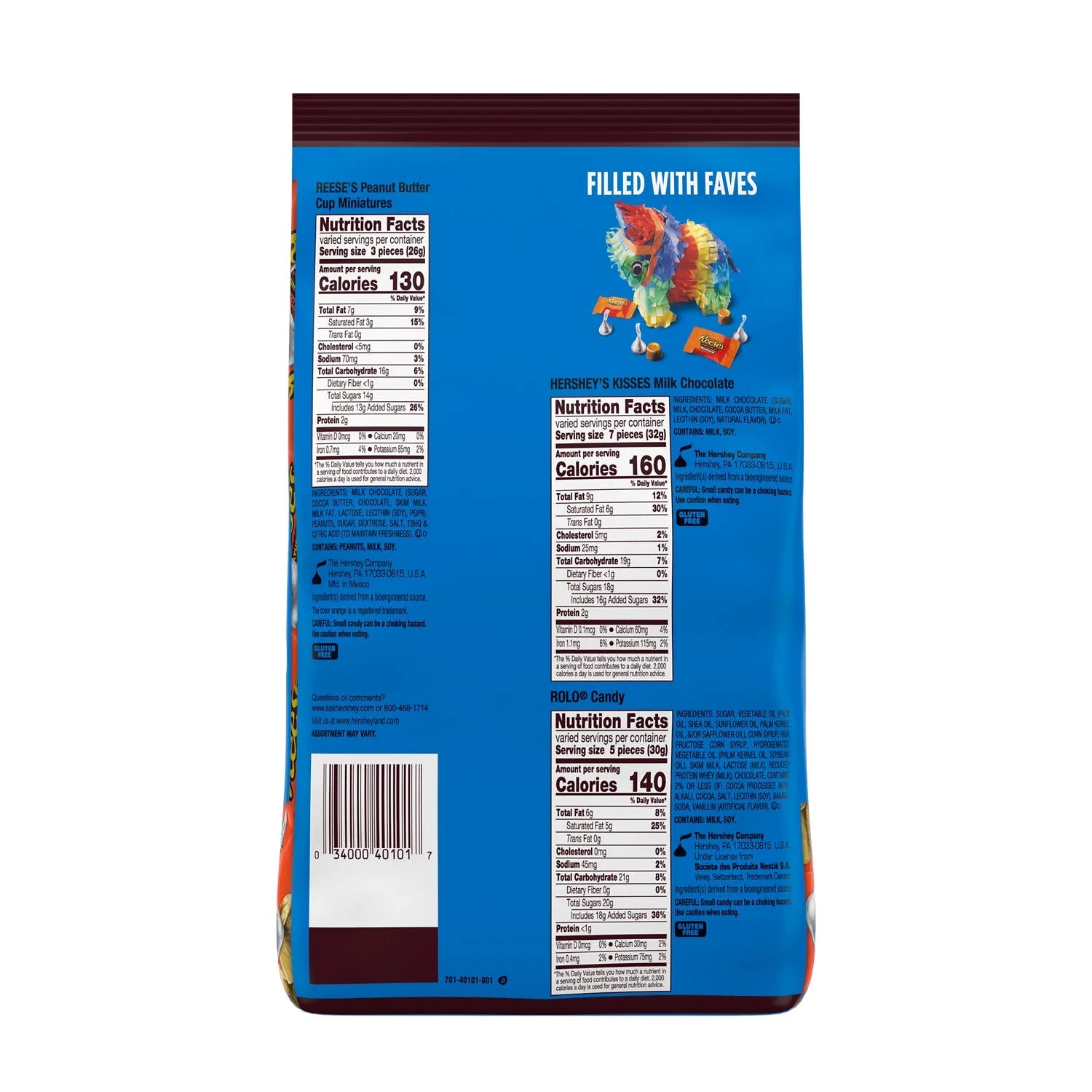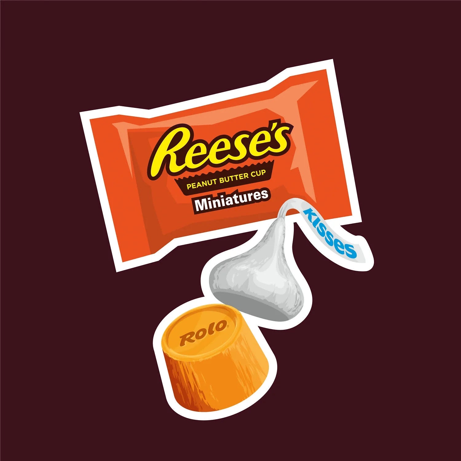 • Includes HERSHEY'S KISSES milk chocolate candy, ROLO rich chocolate caramel candy and REESE'S Miniatures milk chocolate peanut butter cups candy