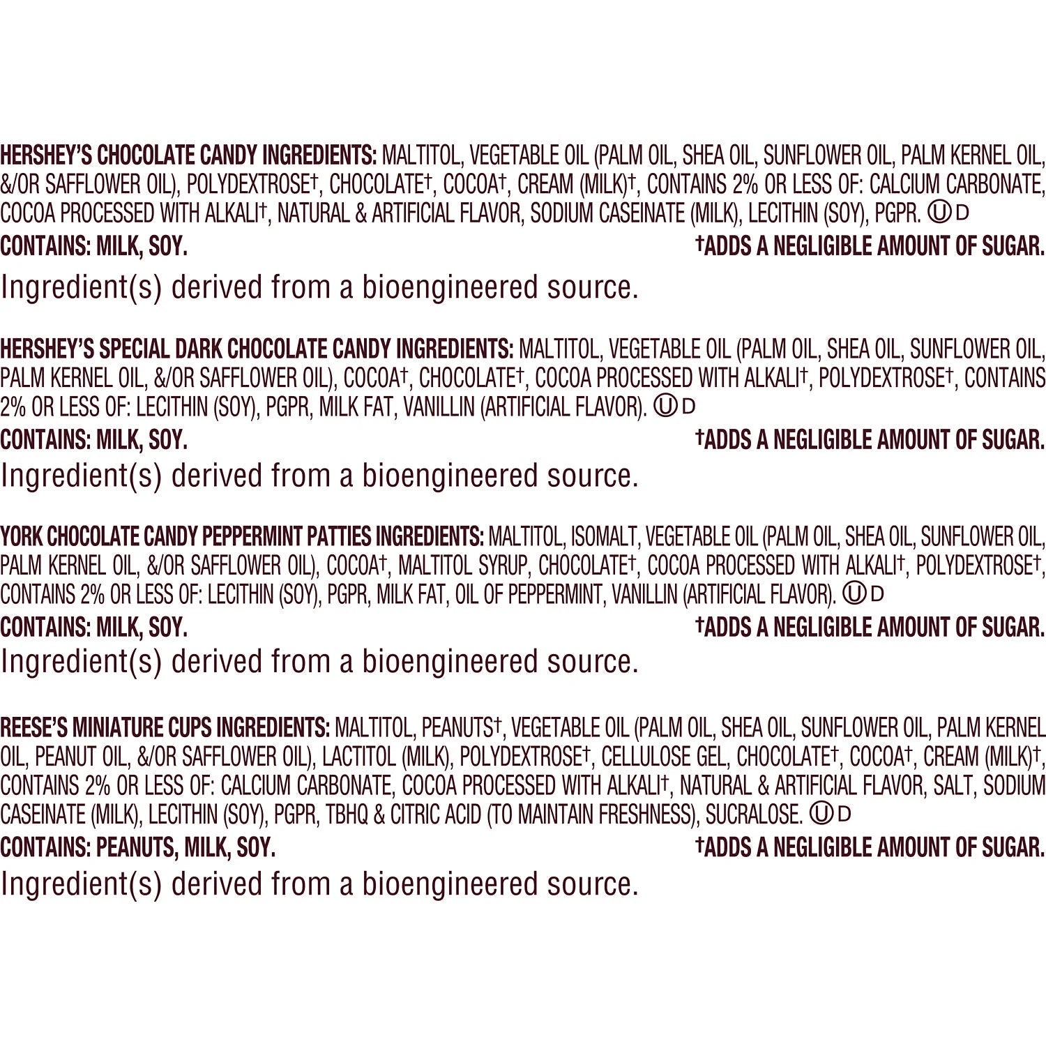HERSHEY'S CHOCOLATE CANDY INGREDIENTS: MALTITOL, COCOA BUTTER, CHOCOLATE, POLYDEXTROSE", CREAM (MILK), MILK FAT, CONTAINS 2% OR LESS OF: CALCIUM CARBONATE, COCOA PROCESSED WITH ALKALI, MALTODEXTRIN, SODIUM CASEINATE (MILK), LECITHIN (SOY), NATURAL & ARTIFICIAL FLAVOR, PGPR. CONTAINS: MILK, SOY. *ADDS A NEGLIGIBLE AMOUNT OF SUGAR Ingredient(s) derived from a bioengineered source. HERSHEY'S SPECIAL DARK CHOCOLATE CANDY INGREDIENTS: MALTITOL, CHOCOLATE, COCOA BUTTER, COCOA PROCESSED WITH ALKALI, POLYDEXTROSET, MILK FAT, CONTAINS 2% OR LESS OF: LECITHIN (SOY), PGPR, VANILLIN (ARTIFICIAL FLAVOR). ADDS A NEGLIGIBLE AMOUNT OF SUGAR Ingredient(s) derived from a bioengineered source. YORK CHOCOLATE CANDY PEPPERMINT PATTIES INGREDIENTS: MALTITOL, CHOCOLATE, ISOMALT, MALTITOL SYRUP, COCOA BUTTER, COCOA PROCESSED WITH ALKALIT, POLYDEXTROSE, MILK FAT, CONTAINS 2% OR LESS OF: LECITHIN (SOY), PGPR, OIL OF PEPPERMINT, VANILLIN (ARTIFICIAL FLAVOR). CONTAINS: MILK, SOY. MANUFACTURED ON THE SAME EQUIPMENT THAT PROCESSES PEANUTS. Ingredient(s) derived from a bioengineered source. REESE'S MINIATURE CUPS INGREDIENTS: MALTITOL, PEANUTS", COCOA BUTTER, CHOCOLATE, LACTITOL (MILK), CELLULOSE GEL POLYDEXTROSE+, VEGETABLE OIL (PEANUT OIL, PALM KERNEL OIL, PALM OIL), MILK FAT, CONTAINS 2% OR LESS OF: CREAM (MILK)! SALT, LECITHIN (SOY), SODIUM CASEINATE (MILK), NATURAL & ARTIFICIAL FLAVOR, PGPR, SUCRALOSE, TBHQ & CITRIC ACID (TO MAINTAIN FRESHNESS). CONTAINS: PEANUTS, MILK, SOY. ADDS A NEGLIGIBLE AMOUNT OF SUGAR Ingredient(s) derived from a bioengineered source./div>