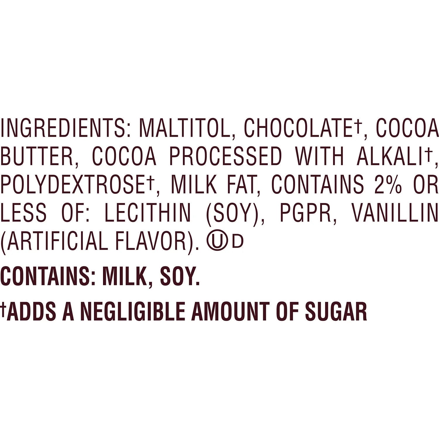 MALTITOL, CHOCOLATE†, COCOA BUTTER, COCOA PROCESSED WITH ALKALI†, POLYDEXTROSE†, MILK FAT, CONTAINS 2% OR LESS OF: LECITHIN (SOY), PGPR, VANILLIN (ARTIFICIAL FLAVOR). †ADDS A NEGLIGIBLE AMOUNT OF SUGAR/div>