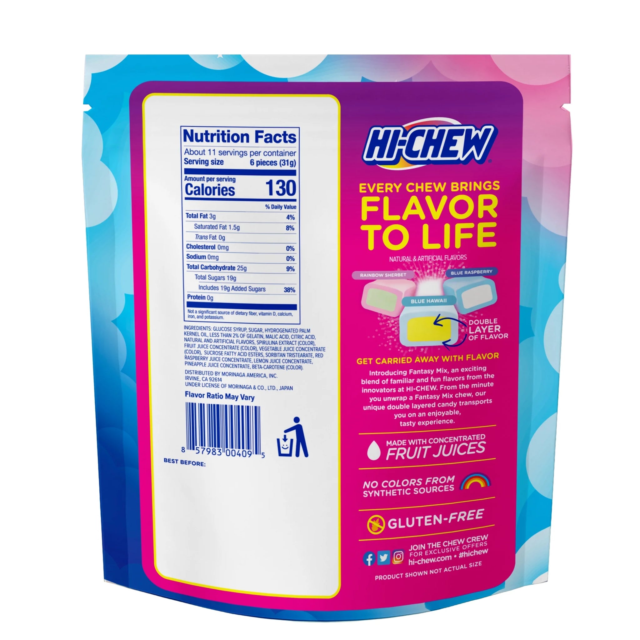 Hi-Chew Fantasy Mix Chewy Candy, 11.65 oz, Bag. HI-CHEW™ Fantasy Mix offers a variety of exotic and traditional fruit-forward flavors, and a smooth, chewy texture unlike any other candy on the market. From the minute you unwrap your HI-CHEW to the very last bite, the aromas of true-to-life fruit flavors are yours to enjoy! With our unique double-layer, mouthwatering flavor is released as you chew for a long-lasting immensely fruity, intensely chewy experience. May contain Soy.