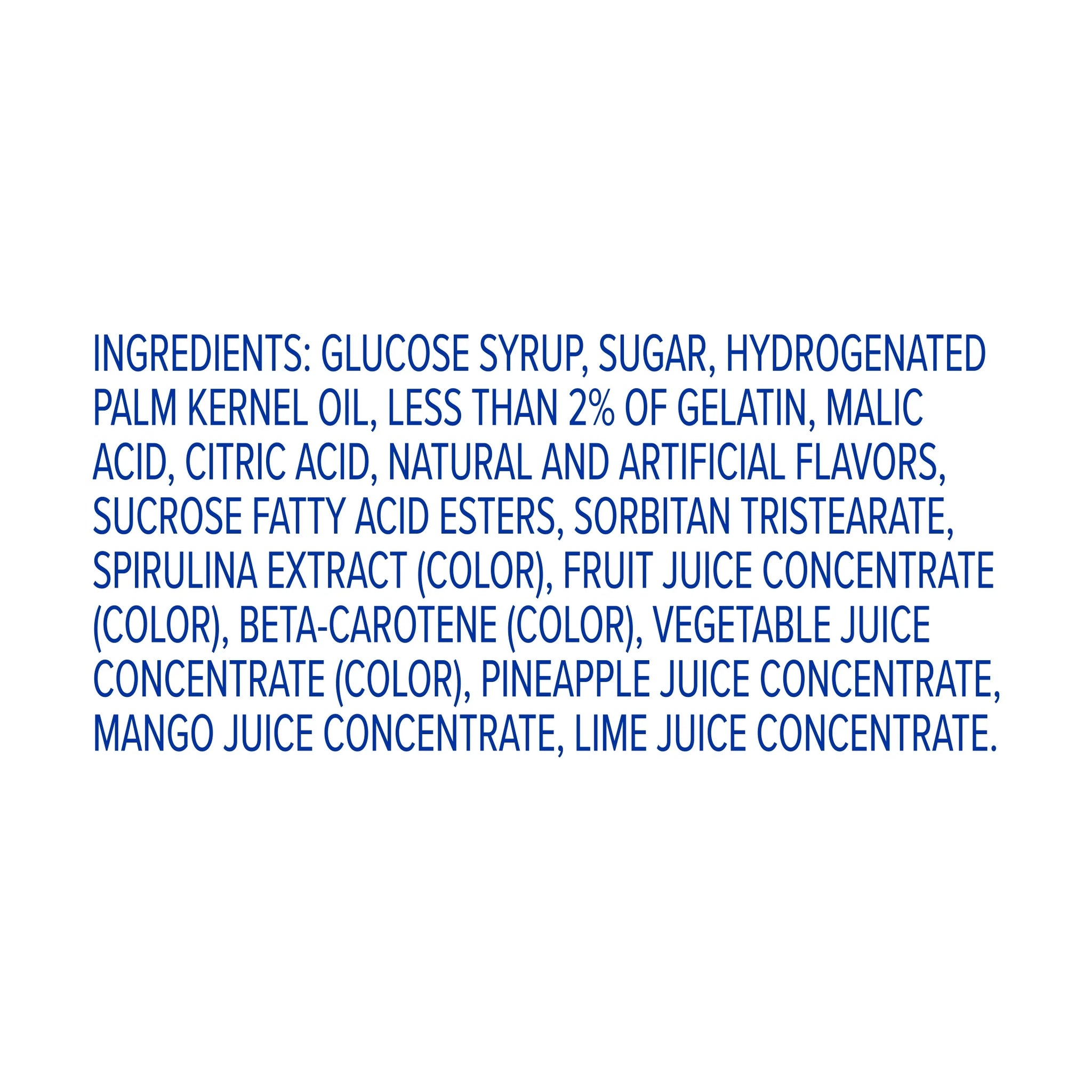 GLUCOSE SYRUP, SUGAR, HYDROGENATED PALM KERNEL OIL, LESS THAN 2% OF GELATIN, MALIC ACID, CITRIC ACID, NATURAL AND ARTIFICIAL FLAVORS, SUCROSE FATTY ACID ESTERS, SORBITAN TRISTEARATE, SPIRULINA EXTRACT (COLOR), FRUIT JUICE CONCENTRATE (COLOR), BETA-CAROTENE (COLOR), VEGETABLE JUICE CONCENTRATE (COLOR), PINEAPPLE JUICE CONCENTRATE, MANGO JUICE CONCENTRATE, LIME JUICE CONCENTRATE/div>