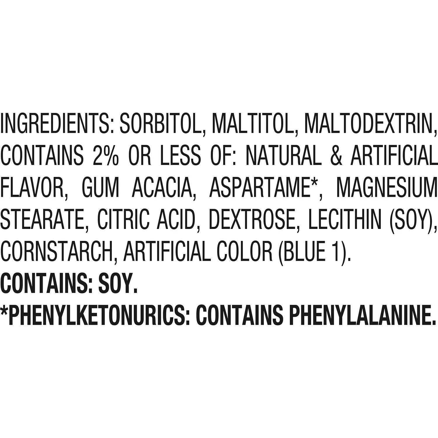 SORBITOL, MALTITOL, MALTODEXTRIN, CONTAINS 2% OR LESS OF: NATURAL & ARTIFICIAL FLAVOR, GUM ACACIA, ASPARTAME*, MAGNESIUM STEARATE, CITRIC ACID, DEXTROSE, LECITHIN (SOY), CORNSTARCH, ARTIFICIAL COLOR (BLUE 1)./div>