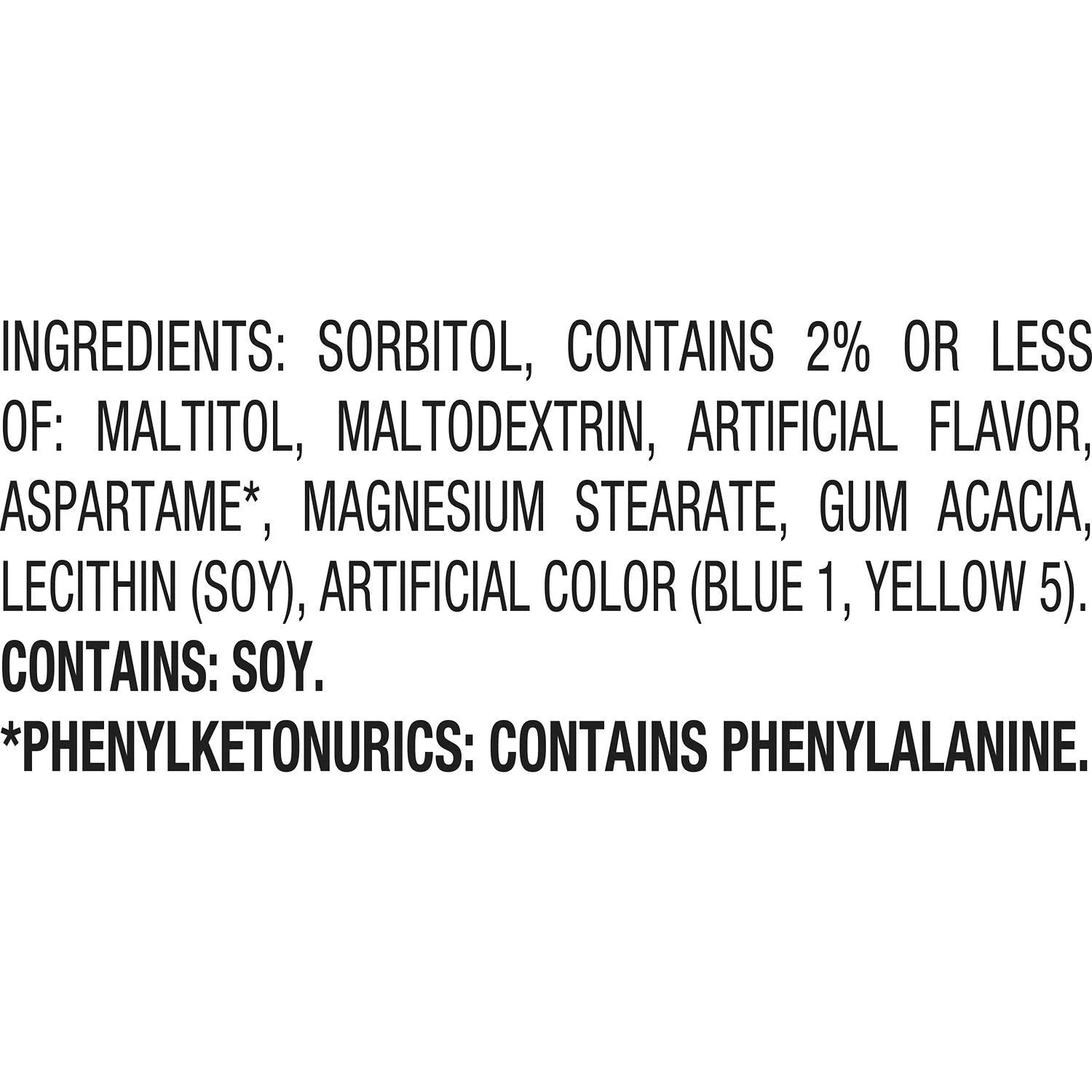 SORBITOL, CONTAINS 2% OR LESS OF: MALTITOL, MALTODEXTRIN, ARTIFICIAL FLAVOR, ASPARTAME*, MAGNESIUM STEARATE, GUM ACACIA, LECITHIN (SOY), ARTIFICIAL COLOR (BLUE 1, YELLOW 5)./div>