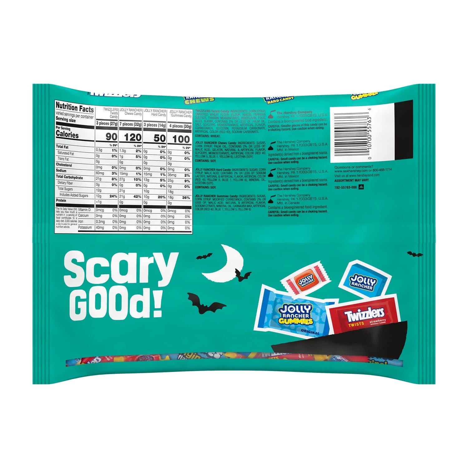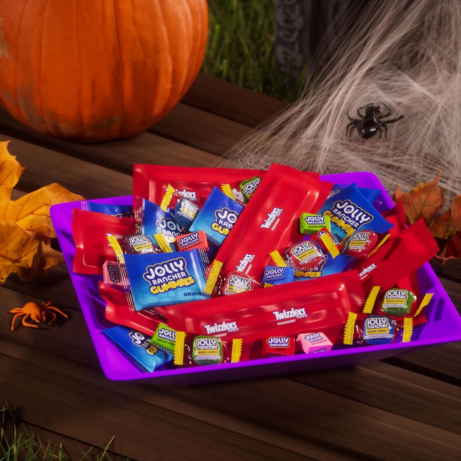 Enjoy a delicious fruit flavored treat anywhere and anytime with this fruity assortment of Halloween candy. Offering four crowd pleasing favorites, this trick or treat candy assortment is perfect for sharing with family, friends, teammates and co-workers. Take this variety candy bag into the office break room, pour some individually wrapped candies into your candy jar at home or take a bag to your next sports game to celebrate the win. This variety bag of assorted fruit flavored candy includes TWIZZLERS Twists strawberry flavored chewy candy, JOLLY RANCHER gummies candy, JOLLY RANCHER hard candy and JOLLY RANCHER Chews candy.