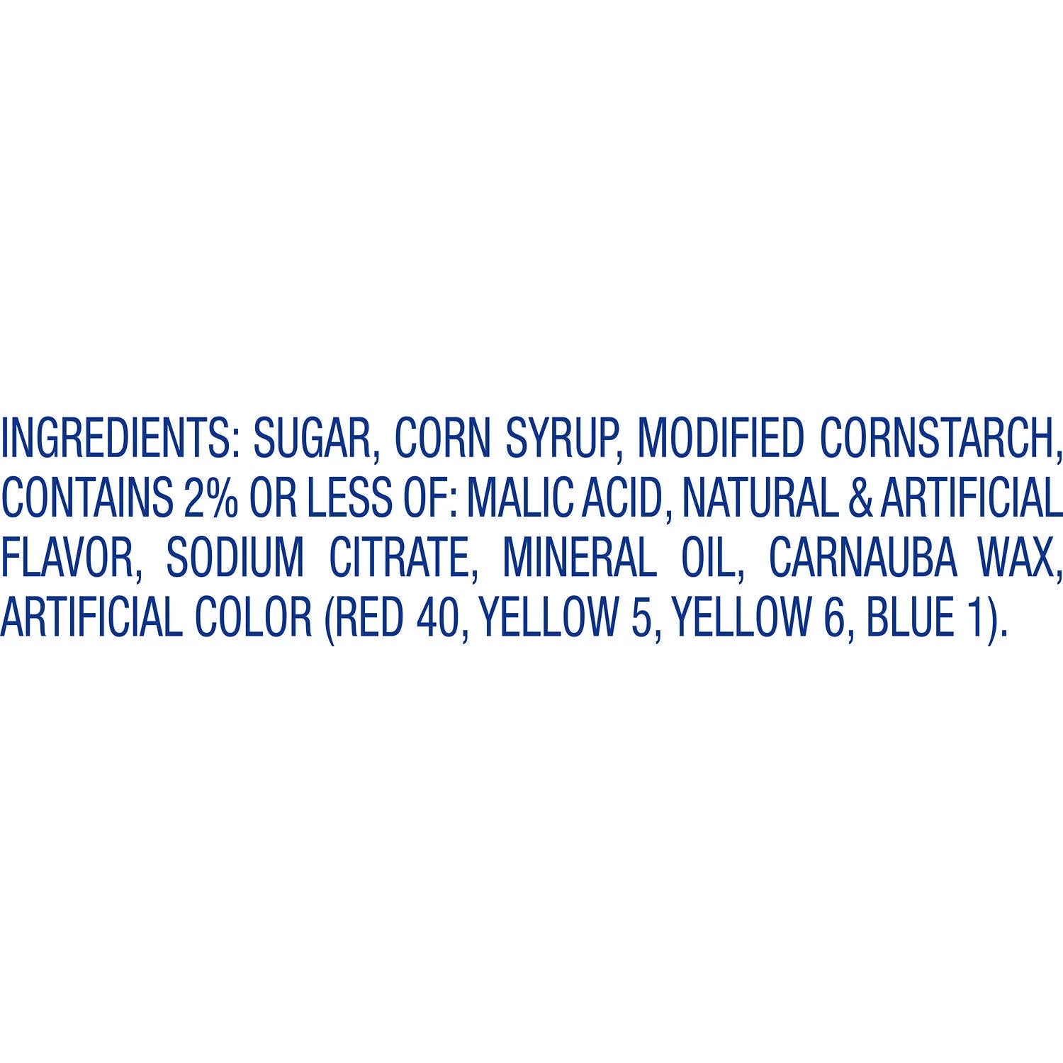 SUGAR, CORN SYRUP, MODIFIED CORNSTARCH, CONTAINS 2% OR LESS OF: MALIC ACID, NATURAL & ARTIFICIAL FLAVOR, SODIUM CITRATE, MINERAL OIL, CARNAUBA WAX, ARTIFICIAL COLOR (RED 40, YELLOW 5, YELLOW 6, BLUE 1)./div>