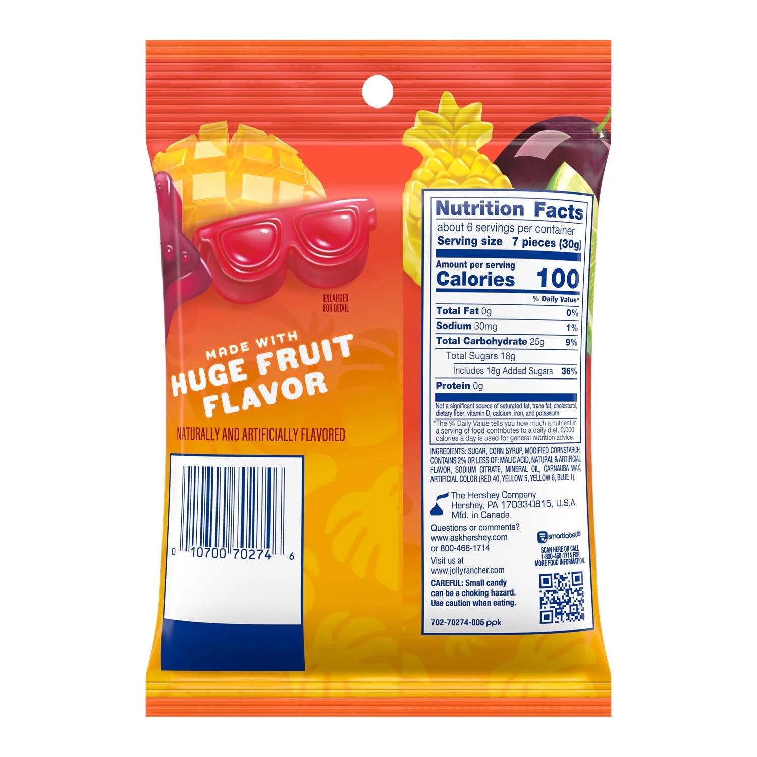A mix of five tropical fruity favorites for the whole family in just one bag of gummies candy? You wouldn't have thought it possible if you didn't know JOLLY RANCHER candy. Each delicious piece of fruit flavored gummies candy in this bag will stay until it's time for a new bag. Featuring tropical fruit punch, golden pineapple, lime, passionfruit and mango flavors, these JOLLY RANCHER gummy candies will take your taste buds on a trip straight to the tropics no matter the time of year.