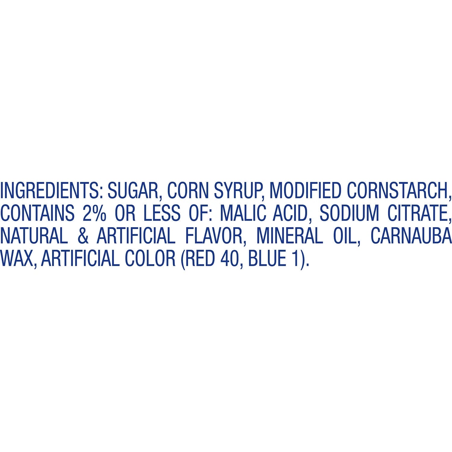 SUGAR, CORN SYRUP, MODIFIED CORNSTARCH, CONTAINS 2% OR LESS OF: MALIC ACID, SODIUM CITRATE, NATURAL & ARTIFICIAL FLAVOR, MINERAL OIL, CARNAUBA WAX, ARTIFICIAL COLOR (RED 40, BLUE 1)/div>