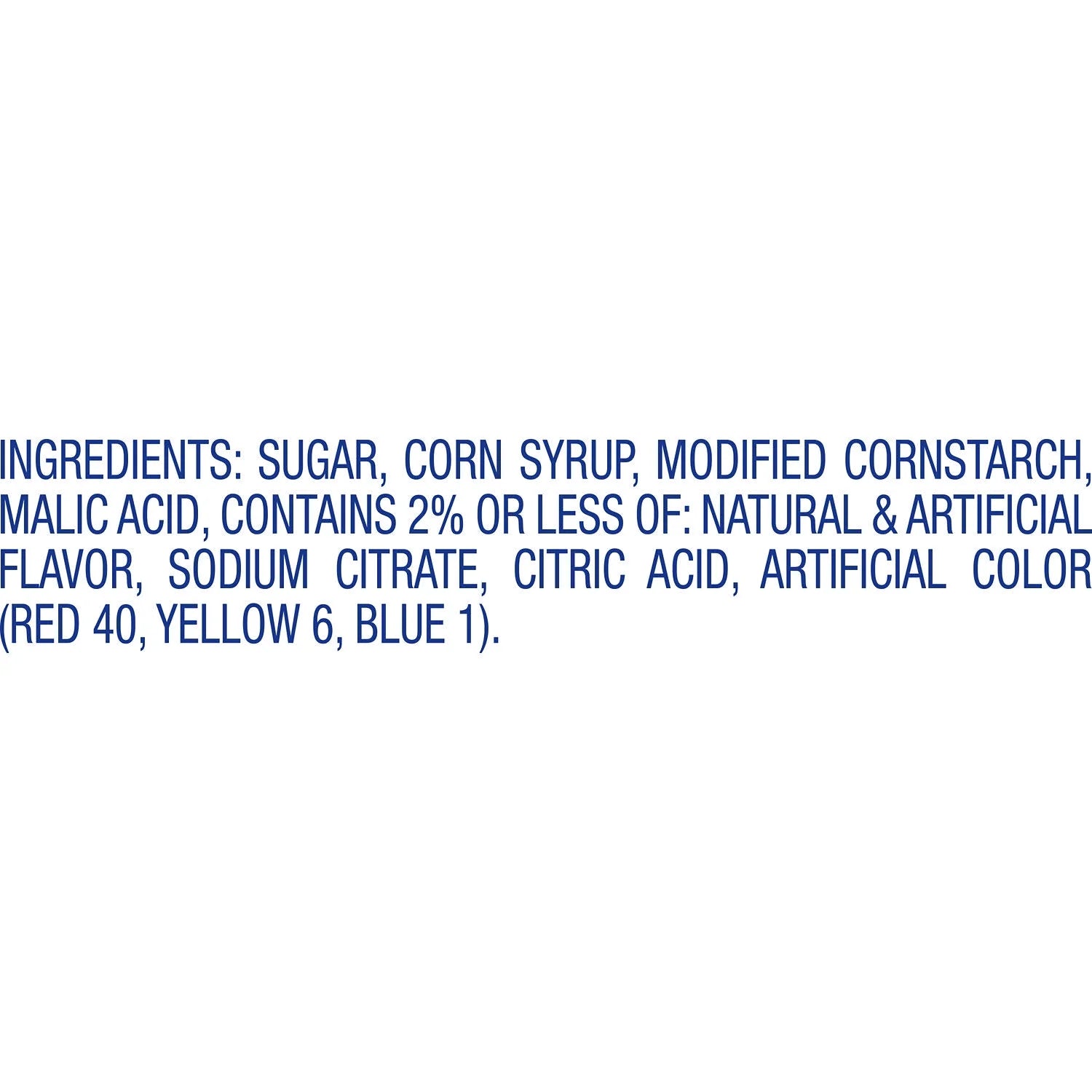 SUGAR, CORN SYRUP, MODIFIED CORNSTARCH, MALIC ACID, CONTAINS 2% OR LESS OF: NATURAL & ARTIFICIAL FLAVOR, SODIUM CITRATE, CITRIC ACID, ARTIFICIAL COLOR (RED 40, YELLOW 6, BLUE 1)./div>