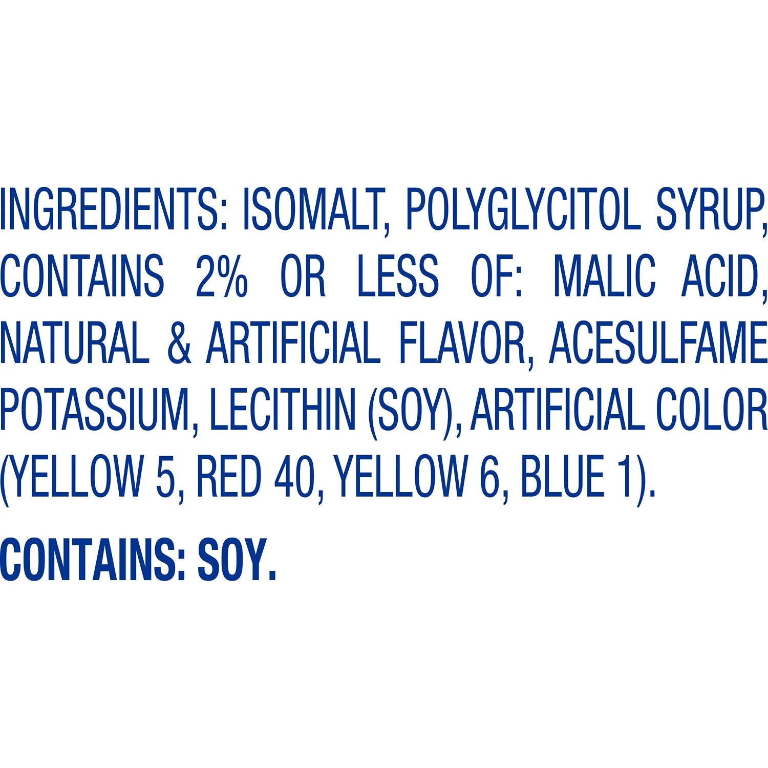 ISOMALT, POLYGLYCITOL SYRUP, CONTAINS 2% OR LESS OF: MALIC ACID, NATURAL & ARTIFICIAL FLAVOR, ACESULFAME POTASSIUM, LECITHIN (SOY), ARTIFICIAL COLOR (YELLOW 5, RED 40, YELLOW 6, BLUE 1)./div>