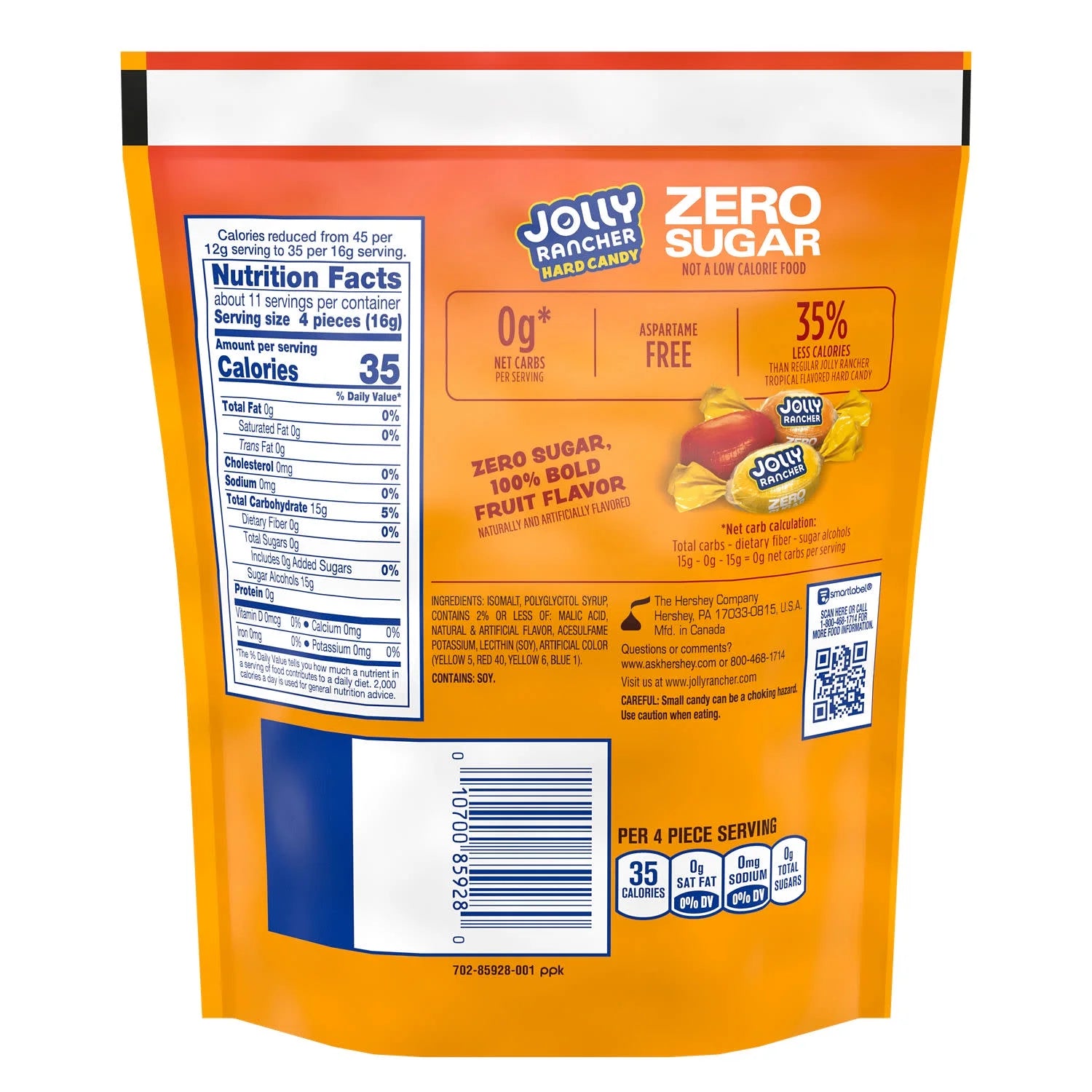 A mix of four fruity favorites for the whole family in just one bag of hard candy? You wouldn't have thought it possible if you didn't know JOLLY RANCHER candy. This bag of sugar free, individually wrapped fruit flavored hard candy will keep each delicious piece until it's time for a new bag. Featuring tropical fruit punch, lime, mango and golden pineapple flavors, JOLLY RANCHER Zero Sugar hard candy offers a combination of fun and delicious flavors with a sugar and aspartame free twist.