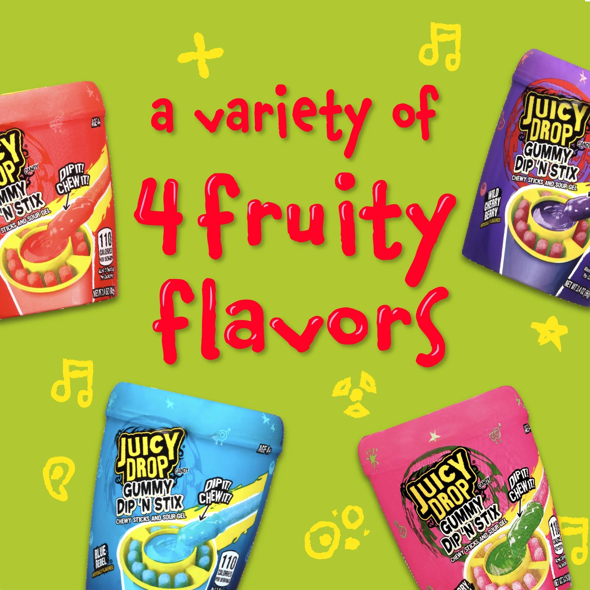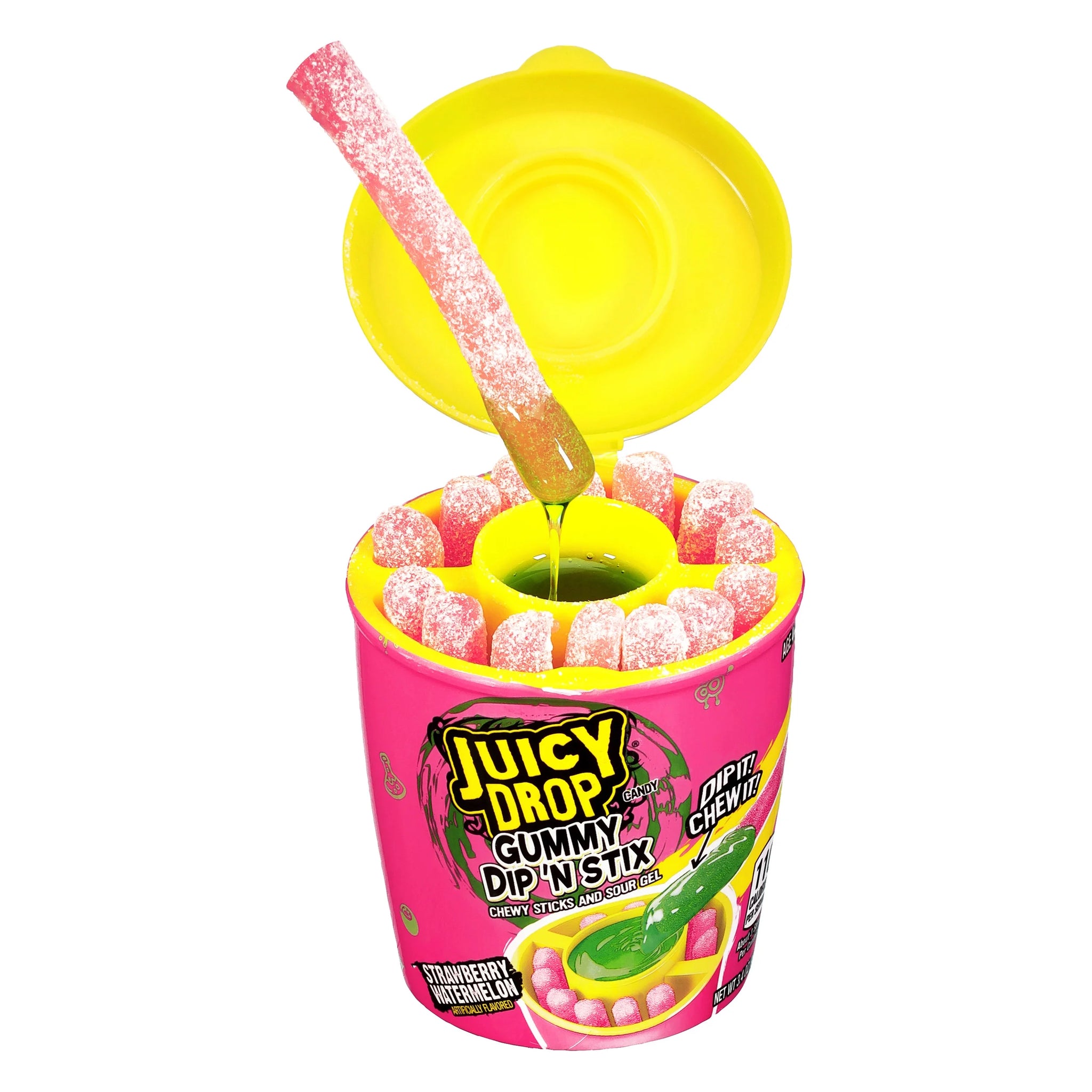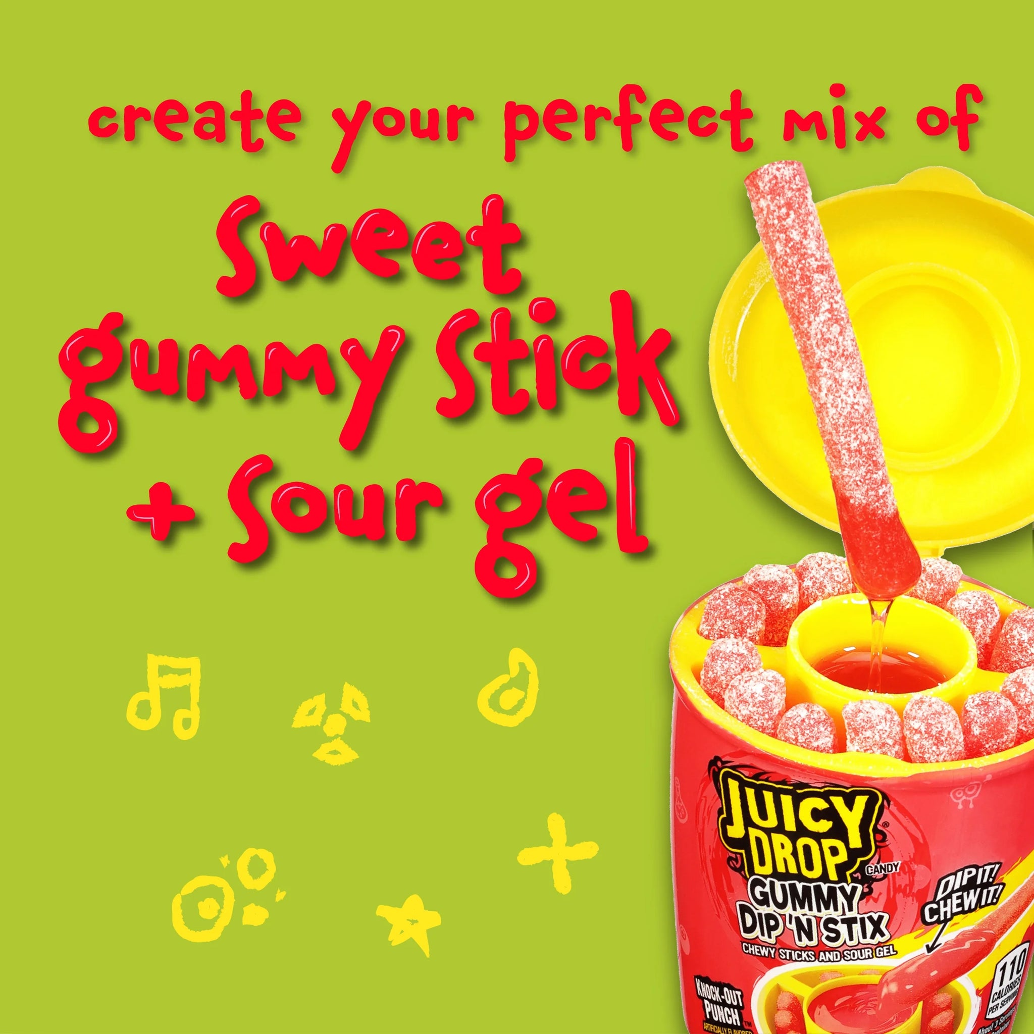 Juicy Drop Gummy Dip ‘N Stix Gluten-Free Regular Size Gummy Candy lets kids create their perfect mix of sweet and sour. Soft chewy gummy sticks that dip into delicious thick sour gel so anyone can create their perfect mix of sweet and sour. Dip as much or as little as you want! Designed to be good for on-the-go, even if that’s just going around the house, each resealable gummy cup is made with firm plastic and a lid that clips shut so it can travel nicely. Juicy Drop Gummy Dip ‘N Stix cups come in 4 mouth-watering sweet and sour flavors: Knock Out Punch, Blue Rebel, Wild Cherry Berry, and Watermelon Blast.