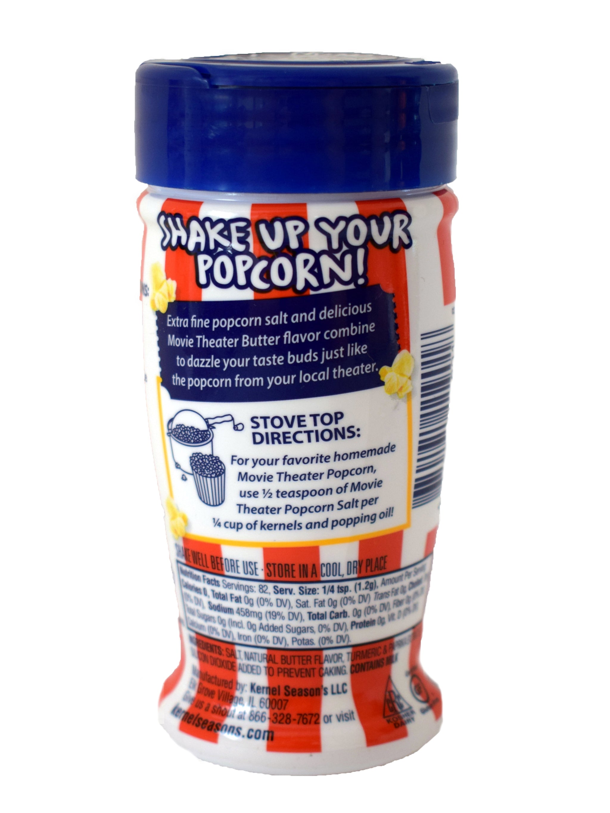 Kernel Season's Jumbo Movie Theater Butter Salt. Extra fine popcorn salt and delicious Movie Theater Butter flavor combine to dazzle your taste buds just like popcorn from your local theatre. All natural and great on popcorn, potatoes, pasta, eggs, vegetables, salads and more. Gluten free, Kosher certified, no MSG, and 0g trans-fat. Proudly shaking up popcorn since 1999 7. 11.75 Ounces