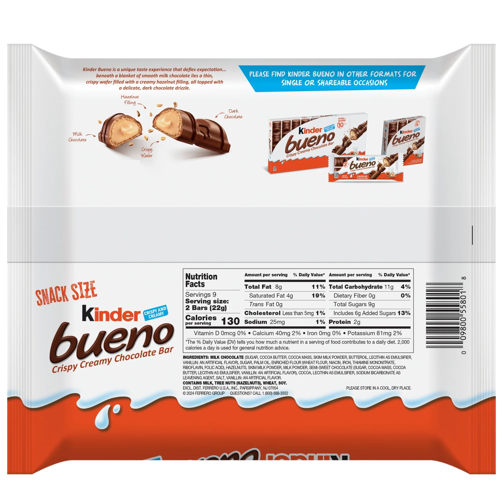 Discover the unique and exceptional taste of Kinder Bueno. This pack contains 18 individually wrapped snack-sized Kinder Bueno chocolate bars, perfect for enjoying with a friend. Smooth milk chocolate, creamy hazelnut filling and a crispy wafer deliver sensational taste with every bite. Make an ordinary moment extraordinary by adding the crispy, creamy deliciousness of a Kinder Bueno milk chocolate bar to your coffee moment or movie night. You can also make your desserts and baked goods more delicious by topping them with Kinder Bueno.