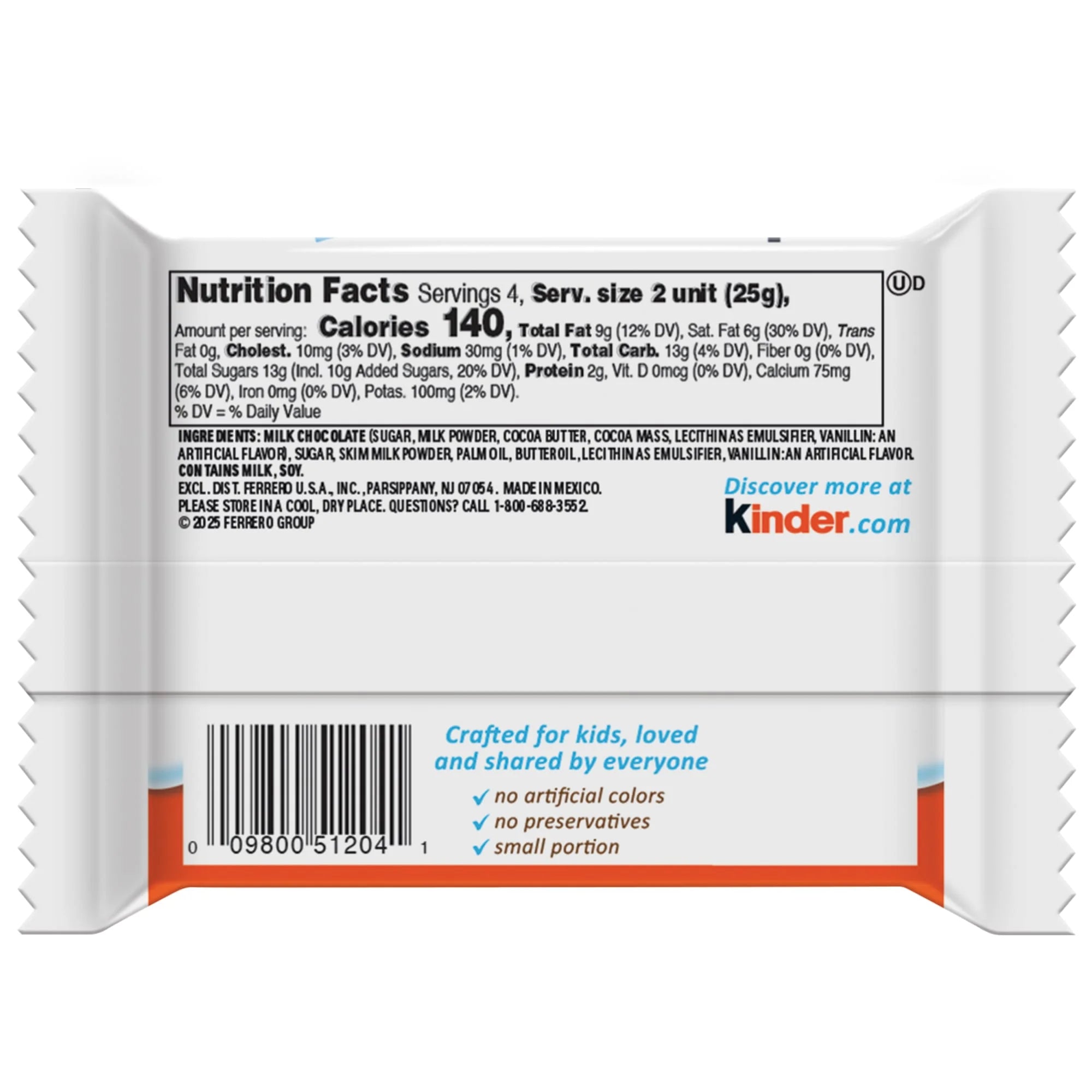 Enjoy smooth milk chocolate with a creamy, milky filling and discover the irresistible taste of Kinder Chocolate in this pack of 4 regular-size chocolate bars. Individually wrapped and perfectly portioned, Kinder Chocolate bars are great for sharing the delicious, creamy taste of Kinder with the ones you love. With Kinder Chocolate, little things really can mean a lot. That's why every bar is made without artificial colors and preservatives. Crafted for kids, loved and shared by all. For over 70 years, Ferrero has created products loved by generations. We've grown from a bakery in Alba, Italy, into a confectionery company loved around the world. We're committed to helping people celebrate life's special moments with high-quality products. *Based upon a survey of 40,000 people by Kantar for America’s favorite chocolate product category.