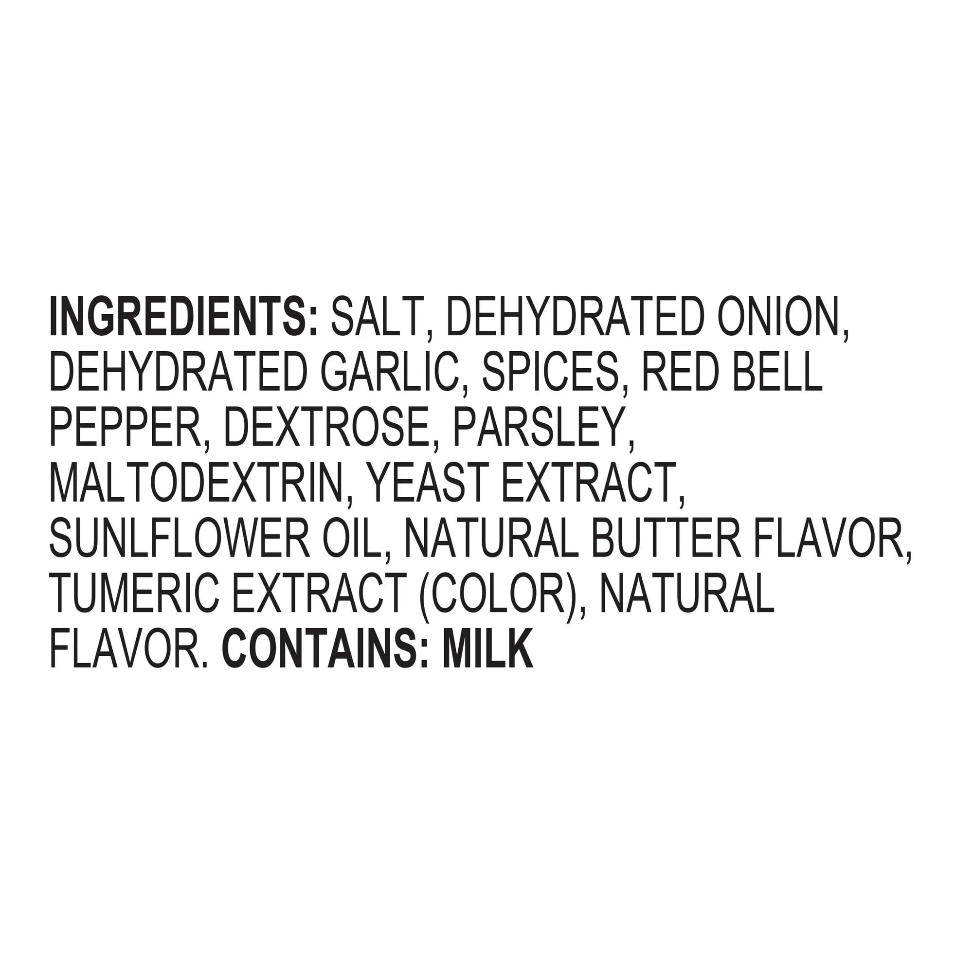 SALT, DEHYDRATED ONION, DEHYDRATED GARLIC, SPICES, RED BELL PEPPER, DEXTROSE, PARSLEY, MALTODEXTRIN, YEAST EXTRACT, SUNFLOWER OIL, NATURAL BUTTER FLAVOR, TURMERIC EXTRACT (COLOR), NATURAL FLAVOR. CONTAINS: MILK/div>