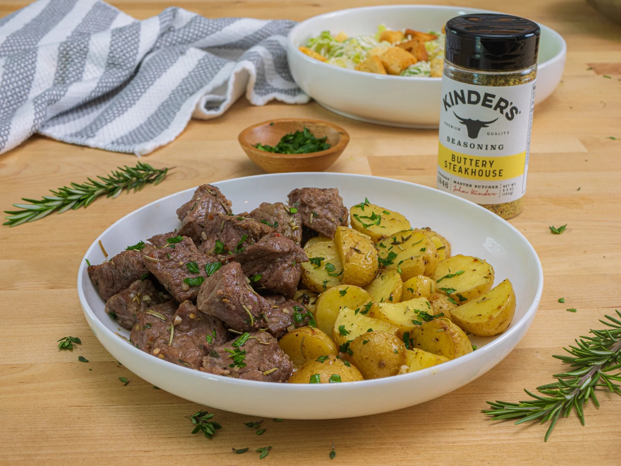 - Heartily season any cut of meat or vegetable with Kinder's Buttery Steakhouse Seasoning; no one can resist the great taste and great flavor of seasoned butter in every single bite.