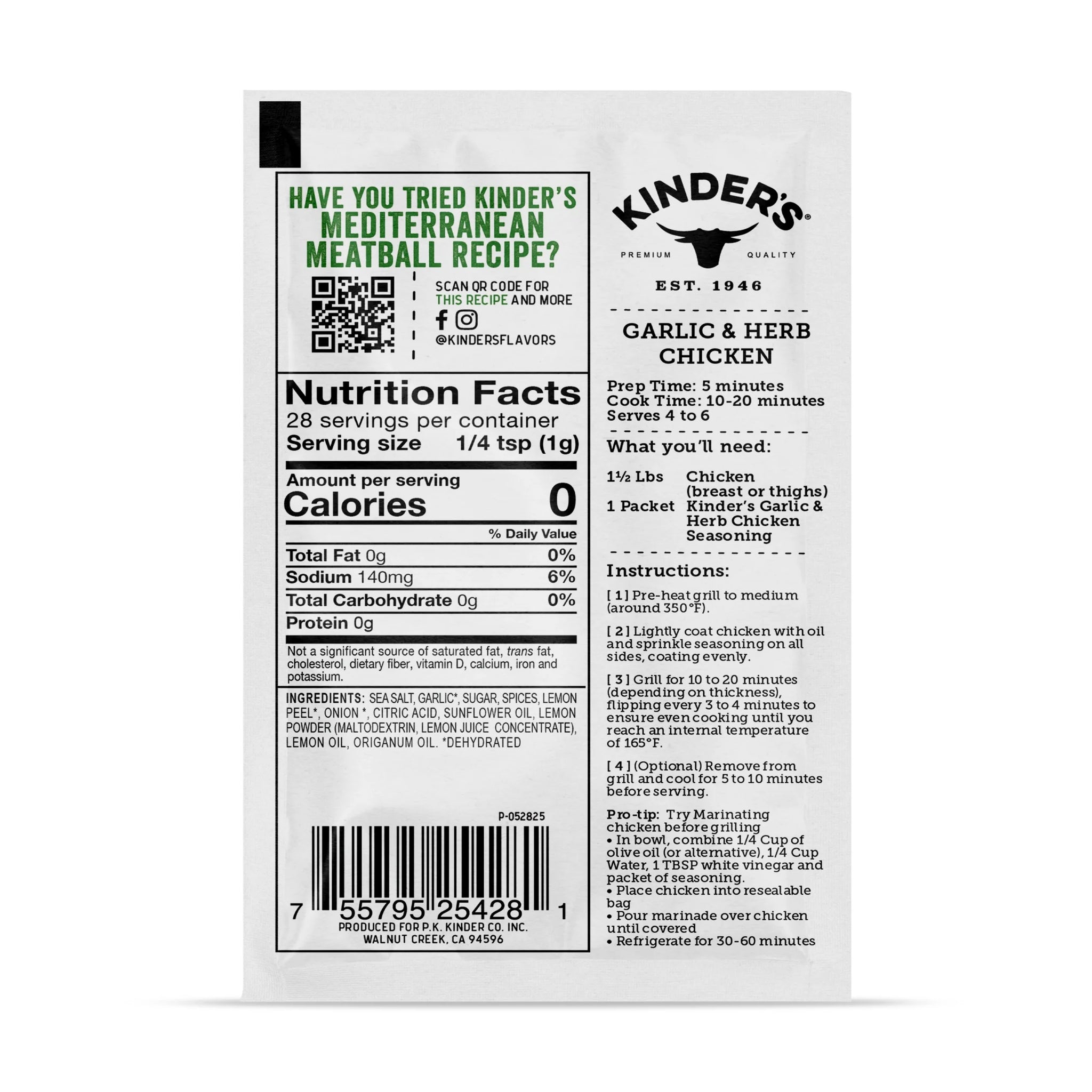 Kinder'S Garlic and Herb Chicken Seasoning Blend with Italian Herbs and Lemon, 1 Oz Packet
