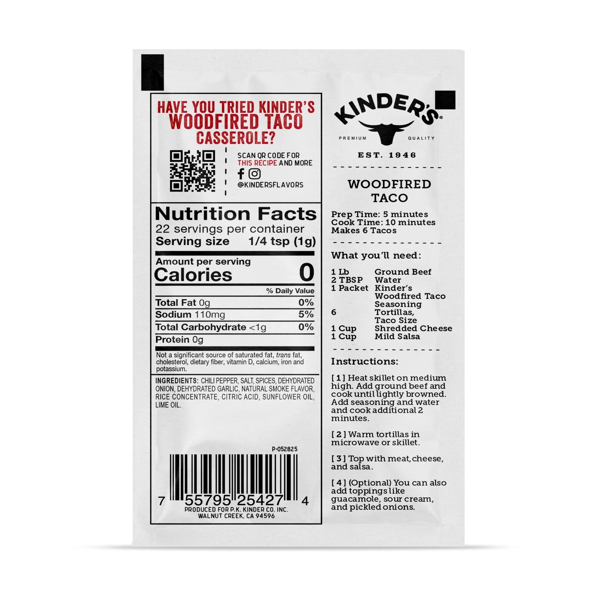 Kinder's Woodfired Taco Seasoning Mix is our bold blend designed to take your Taco Night to the next level. We combine a mix of chilis and garlic seasoning to create a rich, smokey flavor that makes your taco filling taste like it's off the grill! It's a go-to taco essential and an ideal addition to your herbs and spices. Try our woodfired taco seasoning packet with chili dishes, soups, potatoes, rice and beans, and more! We can't wait for you to try it.