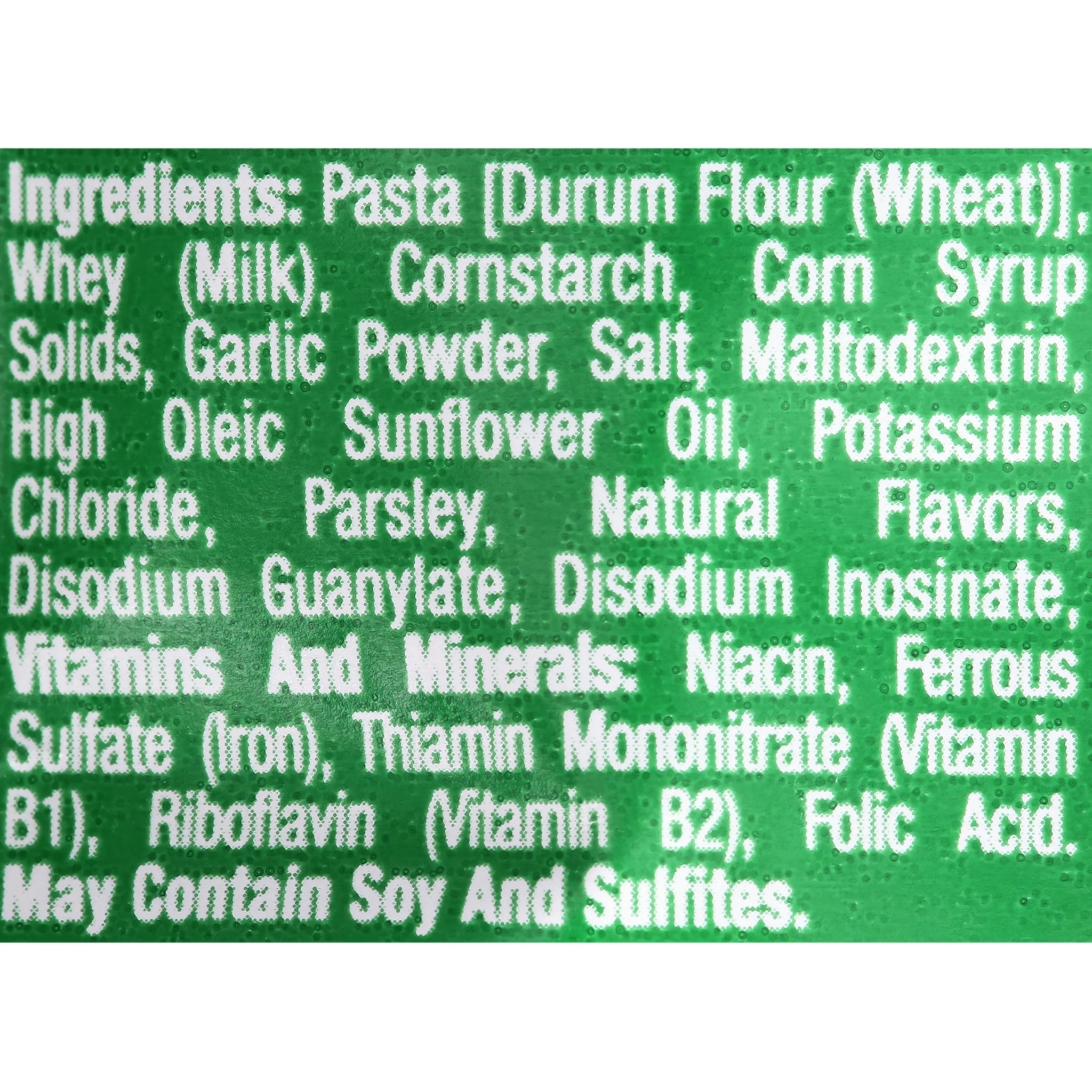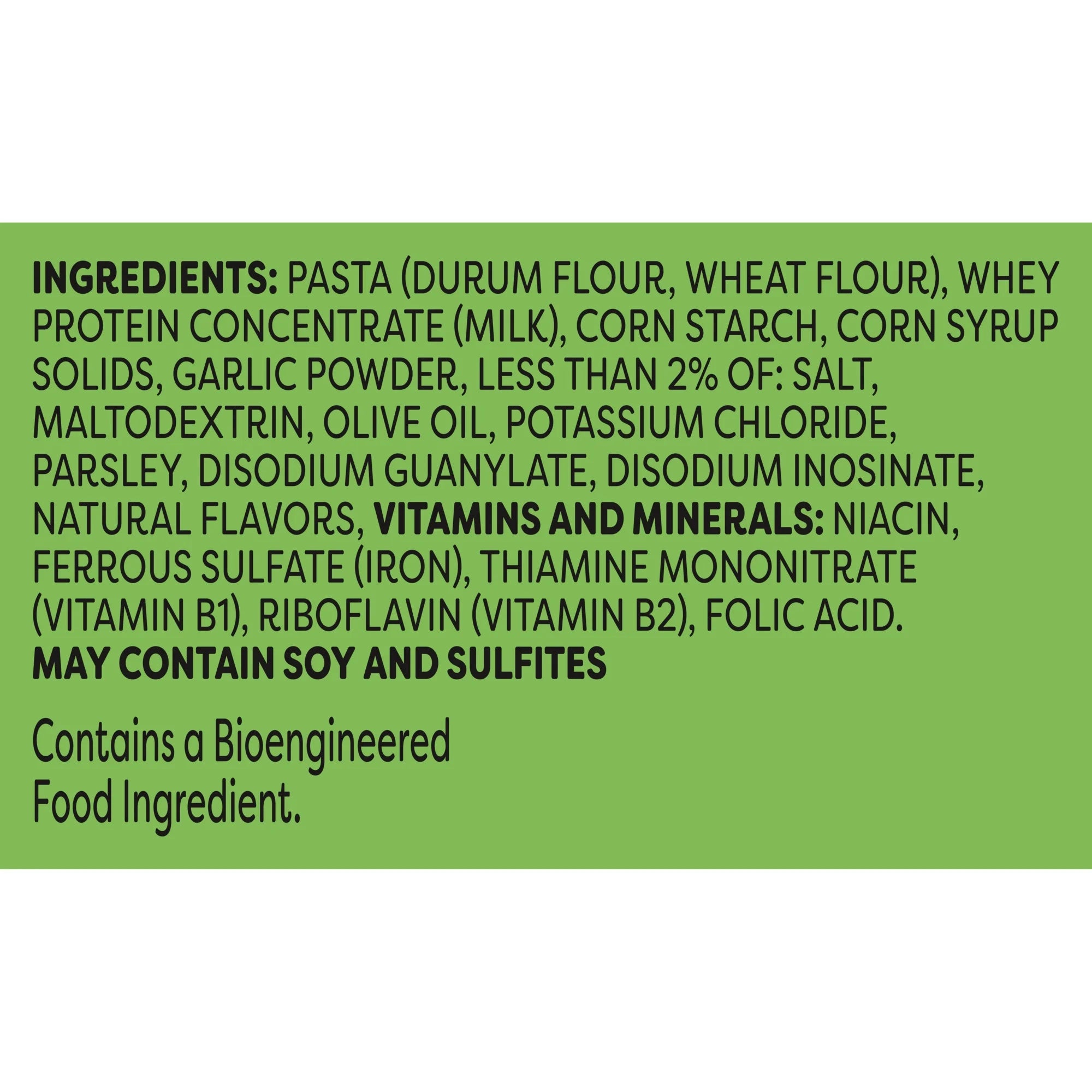 Pasta (Durum Flour, Wheat Flour), Whey Protein Concentrate (Milk), Corn Starch, Corn Syrup Solids, Garlic Powder, Less Than 2% Of: Salt, Maltodextrin, Olive Oil, Potassium Chloride, Parsley, Disodium Guanylate, Disodium Inosinate, Natural Flavors, Vitamins And Minerals: Niacin, Ferrous Sulfate (Iron), Thiamine Mononitrate (Vitamin B1), Riboflavin (Vitamin B2), Folic Acid./div>
