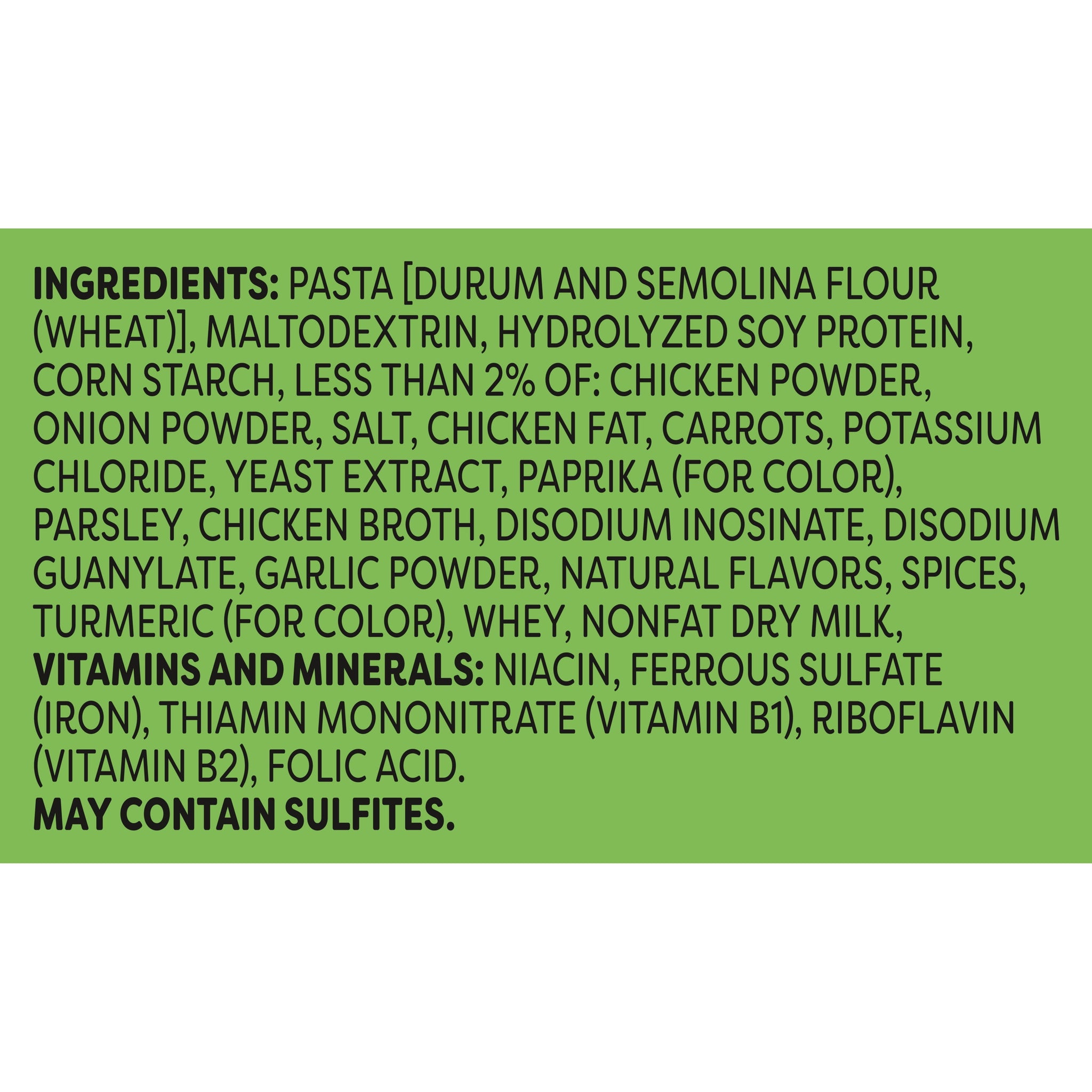 INGREDIENTS: PASTA (DURUM FLOUR, WHEAT FLOUR), CORN STARCH, MALTODEXTRIN, LESS THAN 2% OF: ONION POWDER, SALT, CHICKEN FAT, CARROTS, SILICON DIOXIDE (PREVENTS CAKING), POTASSIUM SALT, YEAST EXTRACT, SPICES, PAPRIKA (FOR COLOR), DISODIUM GUANYLATE, DISODIUM INOSINATE, NATURAL FLAVOR, PARSLEY, TURMERIC (FOR COLOR), MONOSODIUM GLUTAMATE, VITAMINS AND MINERALS: NIACIN, FERROUS SULFATE (IRON), RIBOFLAVIN (VITAMIN B2), THIAMINE MONONITRATE (VITAMIN B1), FOLIC ACID.;/div>