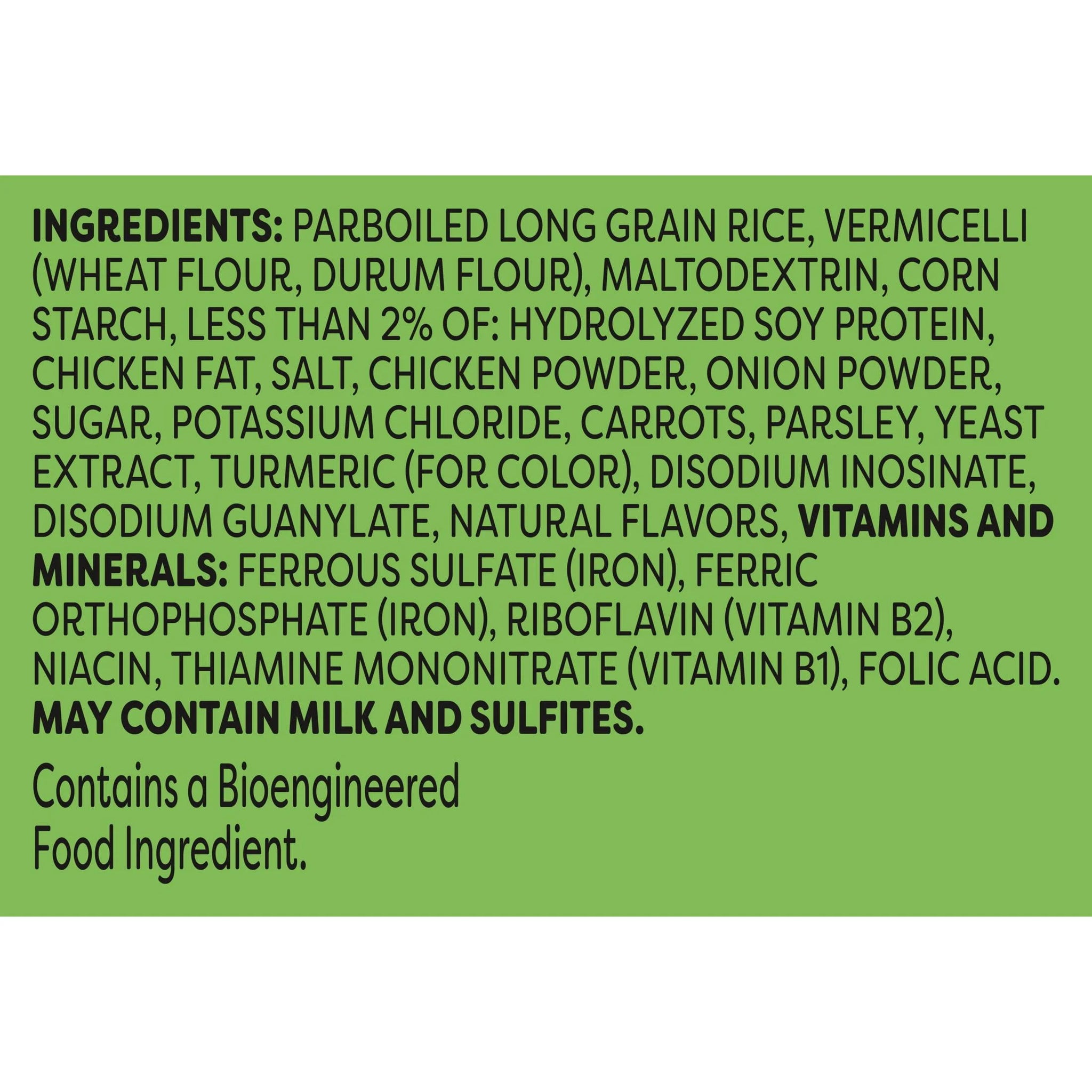 Parboiled Long Grain Rice, Vermicelli (Wheat Flour, Durum Flour), Maltodextrin, Corn Starch, Less Than 2% Of: Hydrolyzed Soy Protein, Chicken Fat, Salt, Chicken Powder, Onion Powder, Sugar, Potassium Chloride, Carrots, Parsley, Yeast Extract, Turmeric (For Color), Disodium Inosinate, Disodium Guanylate, Natural Flavors, Vitamins And Minerals: Ferrous Sulfate (Iron), Ferric Orthophosphate (Iron), Riboflavin (Vitamin B2), Niacin, Thiamine Mononitrate (Vitamin B1), Folic Acid,. May Contain Milk And Sulfites./div>