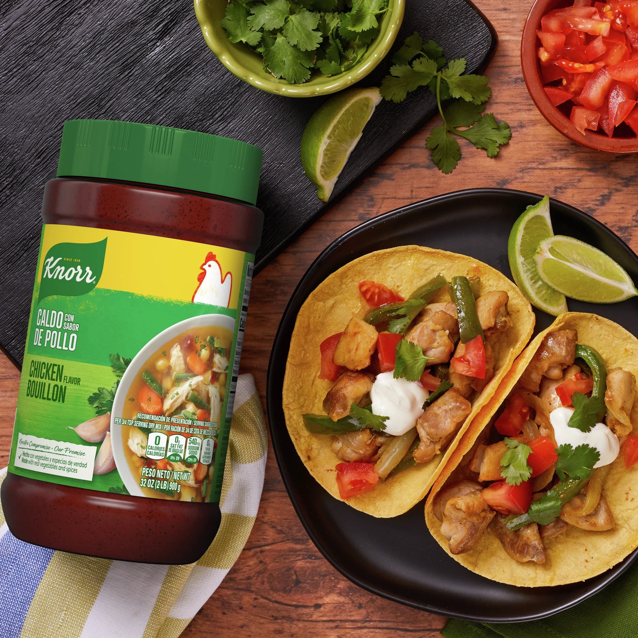 Knorr Shelf Stable Granulated Chicken Bouillon, Is a mix blending flavors of chicken, onion, parsley, and spices together for a rich chicken seasoning. Add the authentic Knorr chicken bouillon flavor to all your chicken dishes. This versatile product is made with natural flavors and is fat-free and cholesterol free. An essential pantry item for everyday use. Granulated bouillon dissolves more quickly than cubes, and 1 tablespoon of granulated bouillon is the equivalent of 1 bouillon cube. Use Knorr Granulated Chicken Flavor Bouillon to enhance flavor in any recipe, like delicious Knorr Chicken Tacos and other chicken dishes.