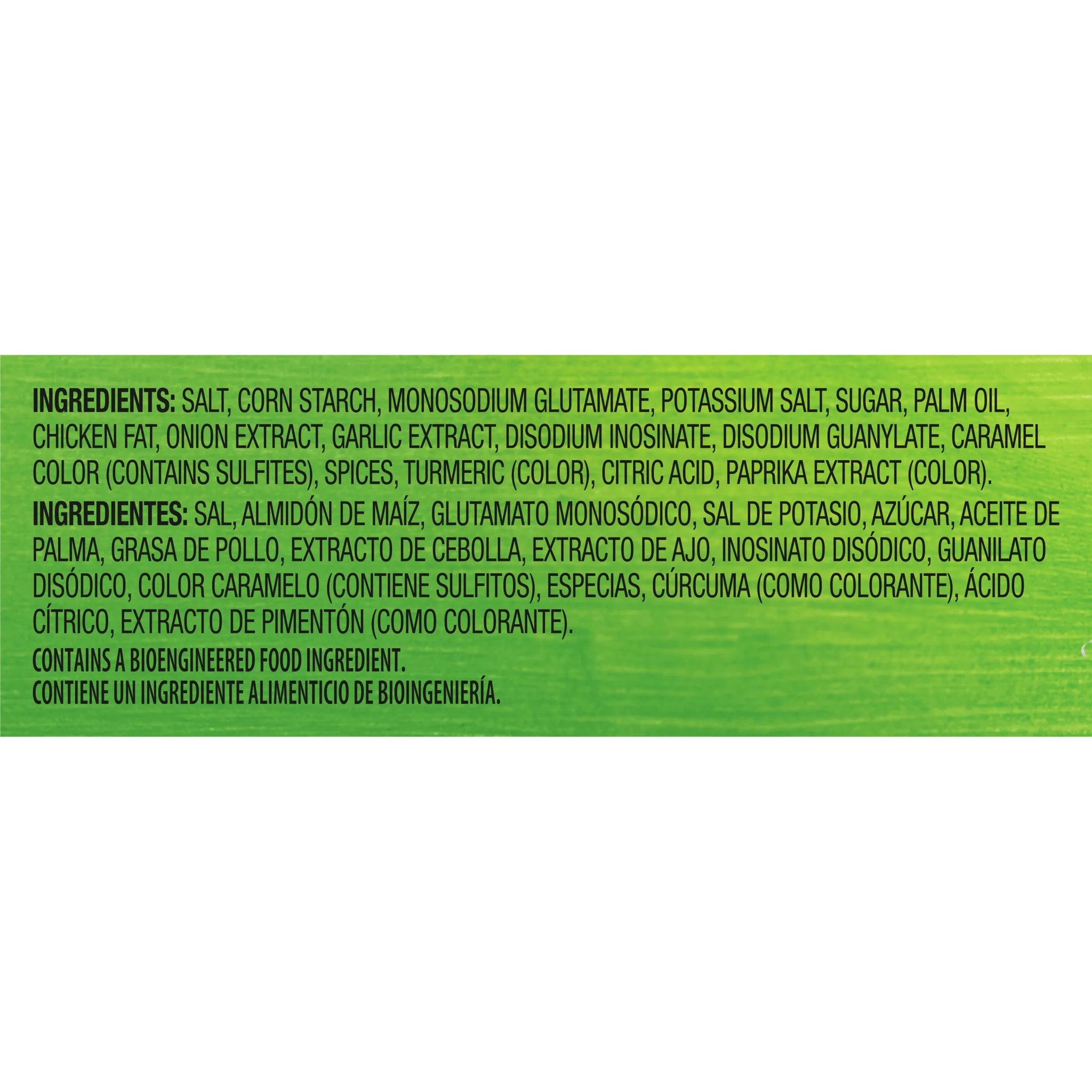 Salt, Corn Starch, Monosodium Glutamate, Potassium Salt, Sugar, Palm Oil, Chicken Fat, Onion Extract, Garlic Extract, Disodium Inosinate, Disodium Guanylate, Caramel Color (Contains Sulfites), Spices, Turmeric (Color), Citric Acid, Paprika Extract (Color)./div>