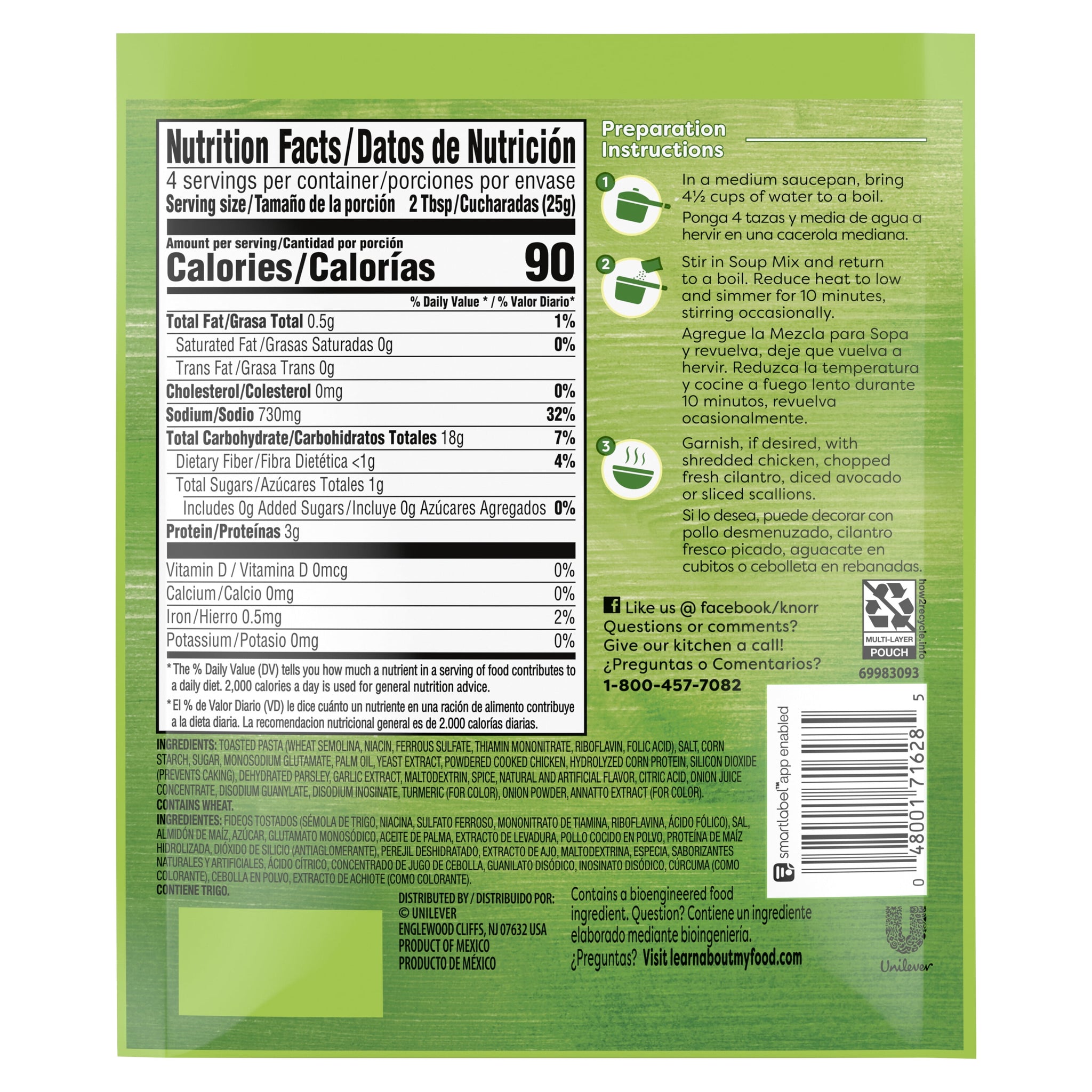 **Please note: packaging may vary ** Knorr Sopa Chicken Noodle Soup Mix is an easy to prepare flavorful dry soup mix. Add the authentic Knorr flavor to all your dishes with this versatile product. This Pasta Soup Mix is ideal to enjoy alone as part of a quick meal, a bowl of soup, a starter course, or you can add additional chicken, beef or vegetables for a heartier and more filling meal. Knorr Sopa Chicken Noodle Soup Mix can also serve as the base of your favorite dish. For an easy and quick to prepare recipe, simply follow these directions. Bring 4 cups of water to a boil, then stir in soup mix and return to a boil. Reduce heat to low and simmer for 10 minutes, stirring occasionally. Garnish, if desired, with chopped cilantro, diced avocado, sliced scallions or shredded cheese. Each individual package makes 4 servings. Knorr Sopas are in a variety of flavors and shapes including Alphabet, Elbows, Stars and Tomato-Based Noodles, so you can be sure to find the Latin flavors your family will love. KnorrĀ® believes that good food matters, and everyday meals can be just as magical as special occasions. Our products owe their taste and flavors to the culinary skills and passion of its chefs. Knorr sources high-quality ingredients to create delicious side dishes, bouillons, sauces, gravies, soups and seasonings enjoyed by families everywhere.