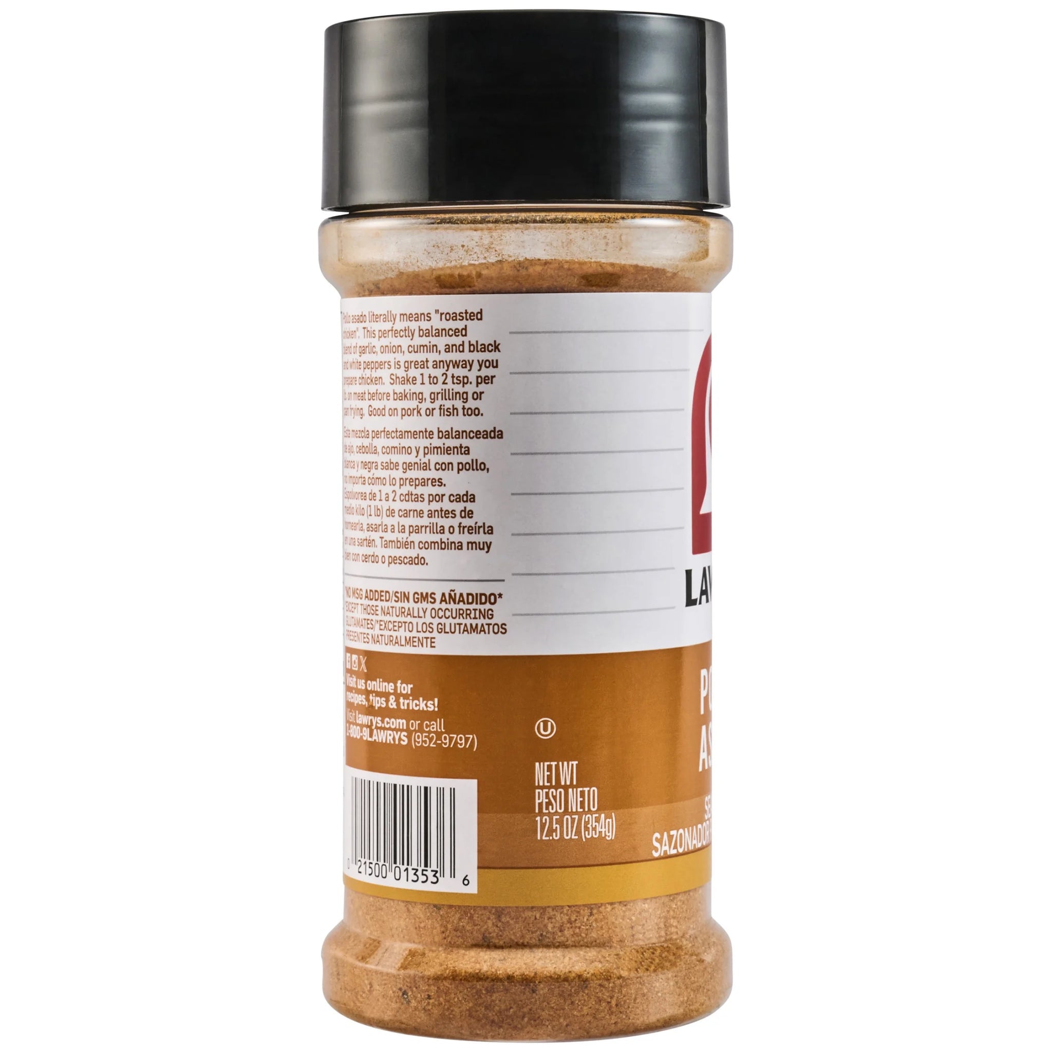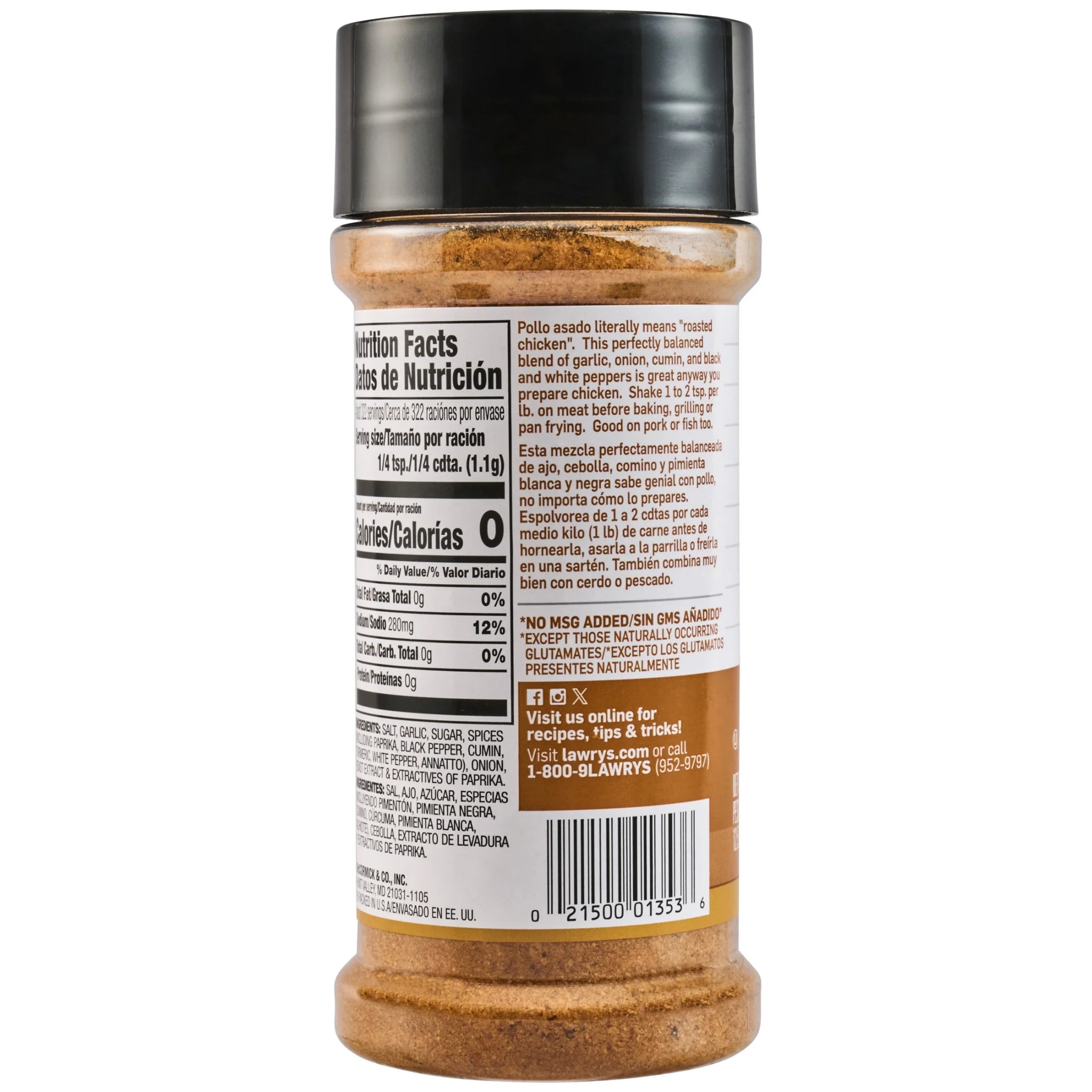 Lawry's Casero Kosher Pollo Asado Seasoning, 12.5 oz Bottle. Pollo asado is Spanish for grilled chicken. Lawry's Casero Pollo Asado Seasoning (Sazonador Para Pollo Asado) is a perfectly balanced blend of garlic, onion, paprika, cumin and black and white peppers- great for any way you're cookin' up your chicken tonight. Shake up your dinner routine with this popular Latin American shake-on seasoning. A sprinkle here and there- think chicken, pork or your favorite veggies- then into the oven, skillet, slow cooker or grill for an easy weeknight recipe. Made without any MSG added*, it's the perfect way to add Latin-inspired flavor to your home-cooked meals. Since 1938, Lawry's is the you know and trust for spices and seasonings that make a good meal great.*Except those naturally occurring glutamates. This Lawry's Casero Pollo Asado Seasoning is in a Plastic bottle that is 12.5 ounces. Store this shelf-stable item at an ambient temperature.