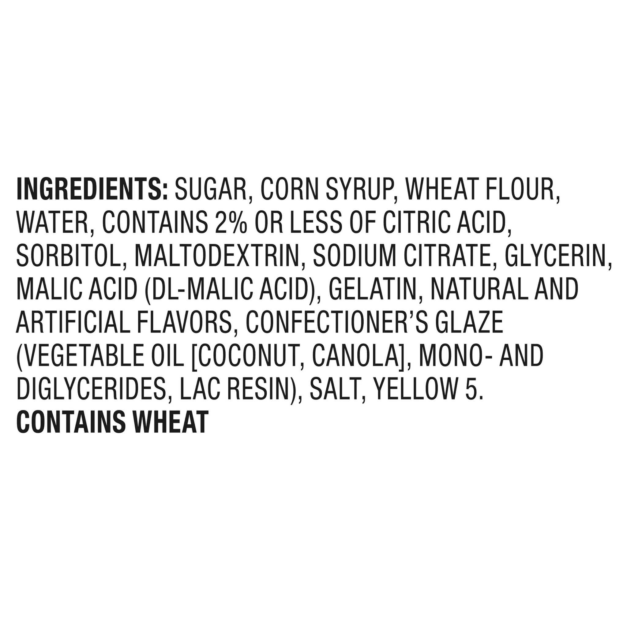 Sugar, Corn Syrup, Wheat Flour, Water, Contains 2% or Less of Citric Acid, Sorbitol, Maltodextrin, Sodium Citrate, Glycerin, Malic Acid (DL-Malic Acid), Gelatin, Natural and Artificial Flavors, Confectioner's Glaze (Vegetable Oil [Coconut, Canola], Mono- and Diglycerides, Lac Resin), Salt, Yellow 5./div>
