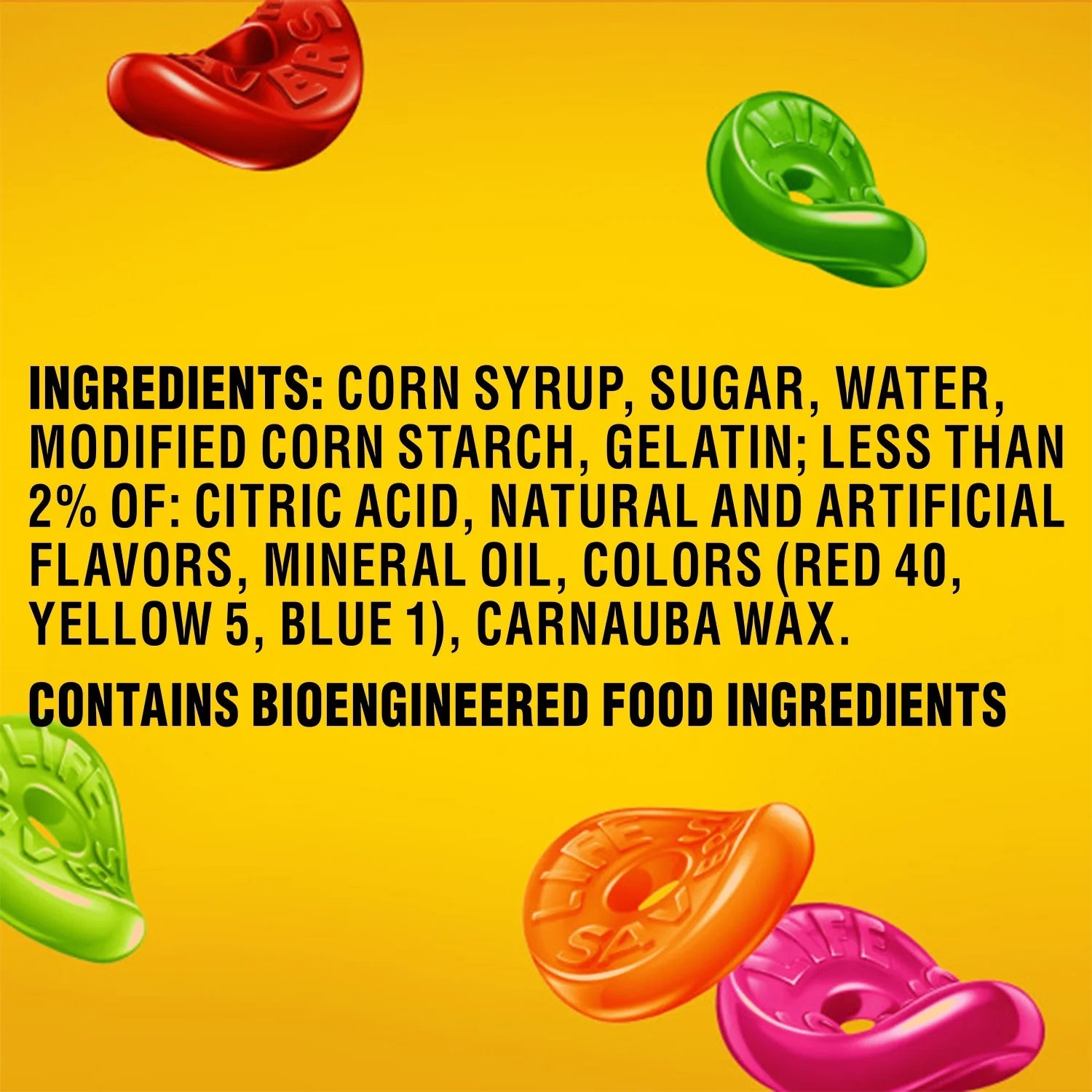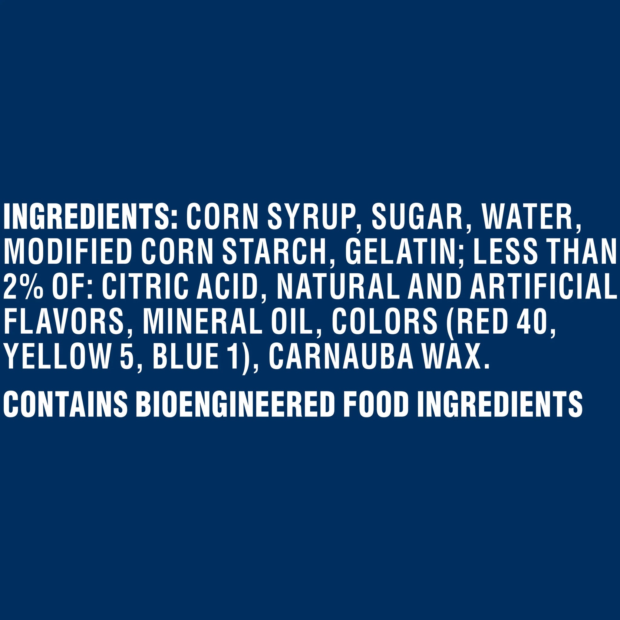 CORN SYRUP, SUGAR, WATER, MODIFIED CORN STARCH, GELATIN; LESS THAN 2% OF: CITRIC ACID, NATURAL AND ARTIFICIAL FLAVORS, MINERAL OIL, COLORS (RED 40, YELLOW 5, BLUE 1), CARNAUBA WAX./div>