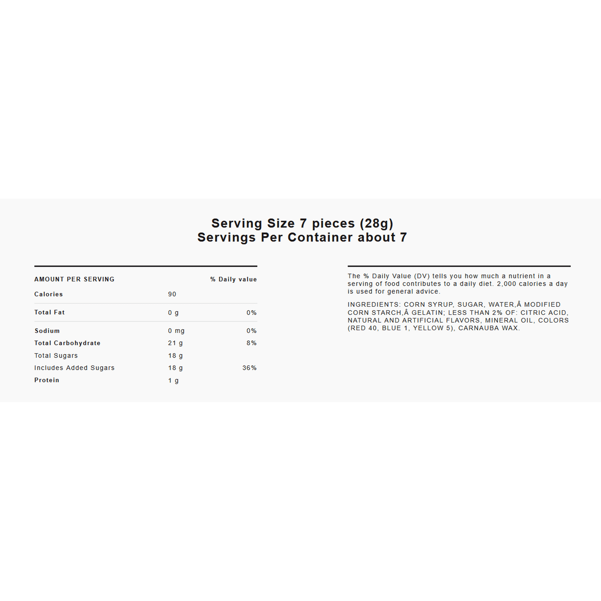 Corn Syrup, Sugar, Water, Modified Corn Starch, Gelatin; Less than 2% of: Citric Acid, Natural and Artificial Flavors, Mineral Oil, Colors (Red 40, Blue 1, Yellow 5), Carnauba Wax./div>