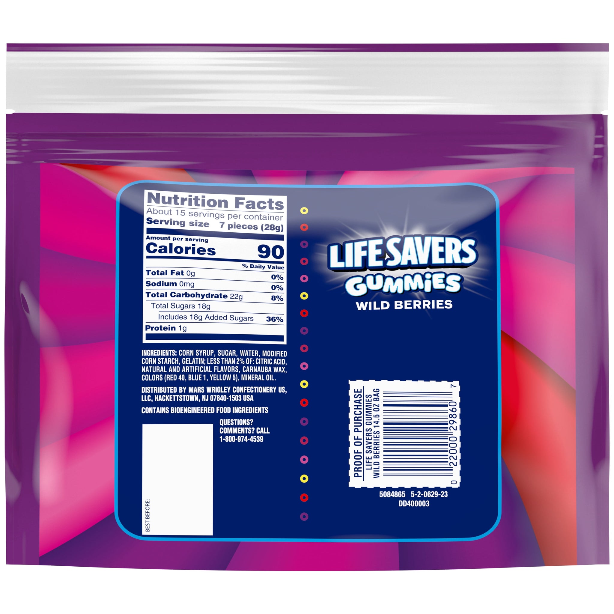 Unleash a 'hole lot of fun with LIFE SAVERS Gummies Wild Berry Gummy Candy! This resealable sharing size pack features delightful wild fruit flavor combinations that will have your taste buds wanting more. Strawberry, Red Raspberry, Blackberry, Black Raspberry, White Grape, and Cherry Berry are the flavors you can expect in this bag of gummy candy. Yum! A sharing size bag of gummy candy is just what you and your friends need for a road trip treat or to enjoy while taking a break from gaming. Looking for a fruity midday pick-me-up? Whether you're at home or the office, ensure the pantry is stocked with these soft and sweet, fruit-flavored gummy treats that are sure to brighten up your day! It's a wild flavor experience you didn't see coming. Order LIFE SAVERS Gummies Wild Berry Gummy Candy assortment today!