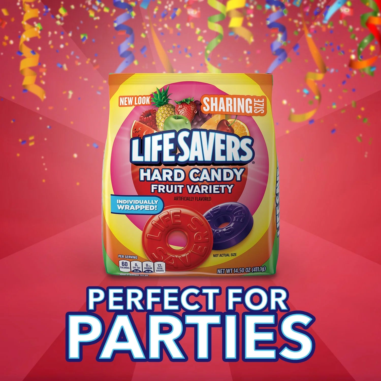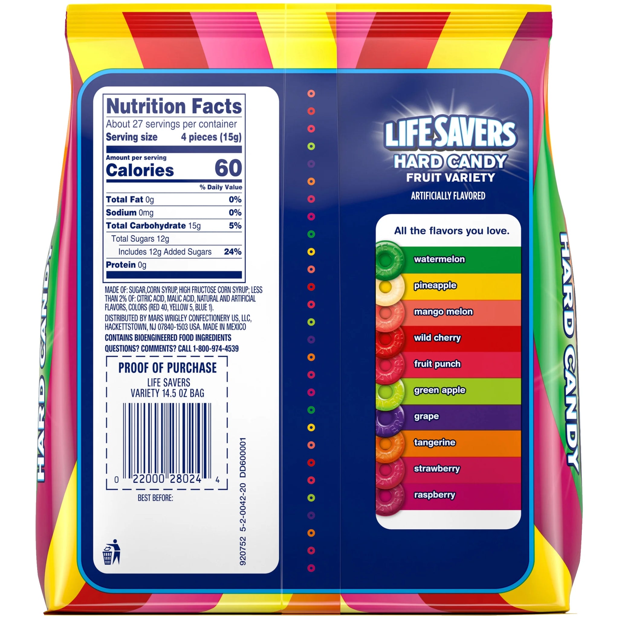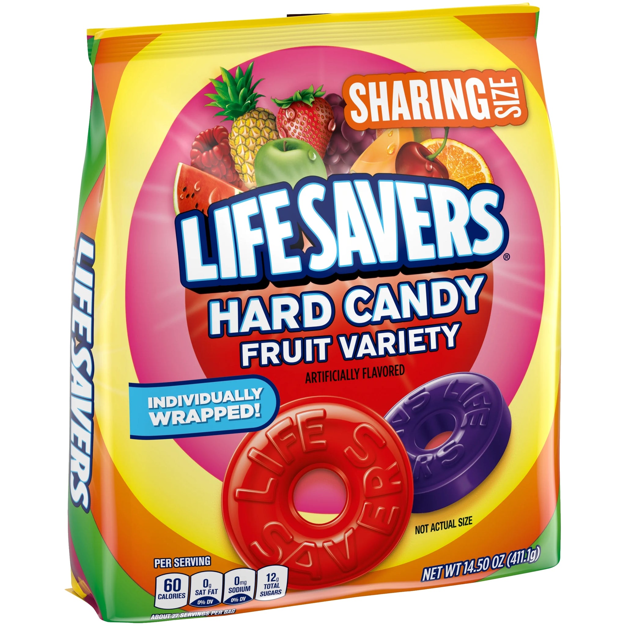 Enjoy your favorite classic candy treat with LIFE SAVERS Fruity Variety Hard Candy, Sharing Size, 14.5 oz, 108 Count. Featuring watermelon, pineapple, mango melon, wild cherry, fruit punch, green apple, grape, tangerine, strawberry and raspberry fruit flavors. Each sharing size bag contains enough hard candy pieces to share with friends, family, or coworkers. The possibilities are endless with this sharing size bag filled with delicious, fruity LIFE SAVERS Hard Candy. Keep some LIFE SAVERS Hard Candy in your desk for an afternoon treat or fill piñatas and office candy dishes with these individually wrapped fruit-flavored candies.