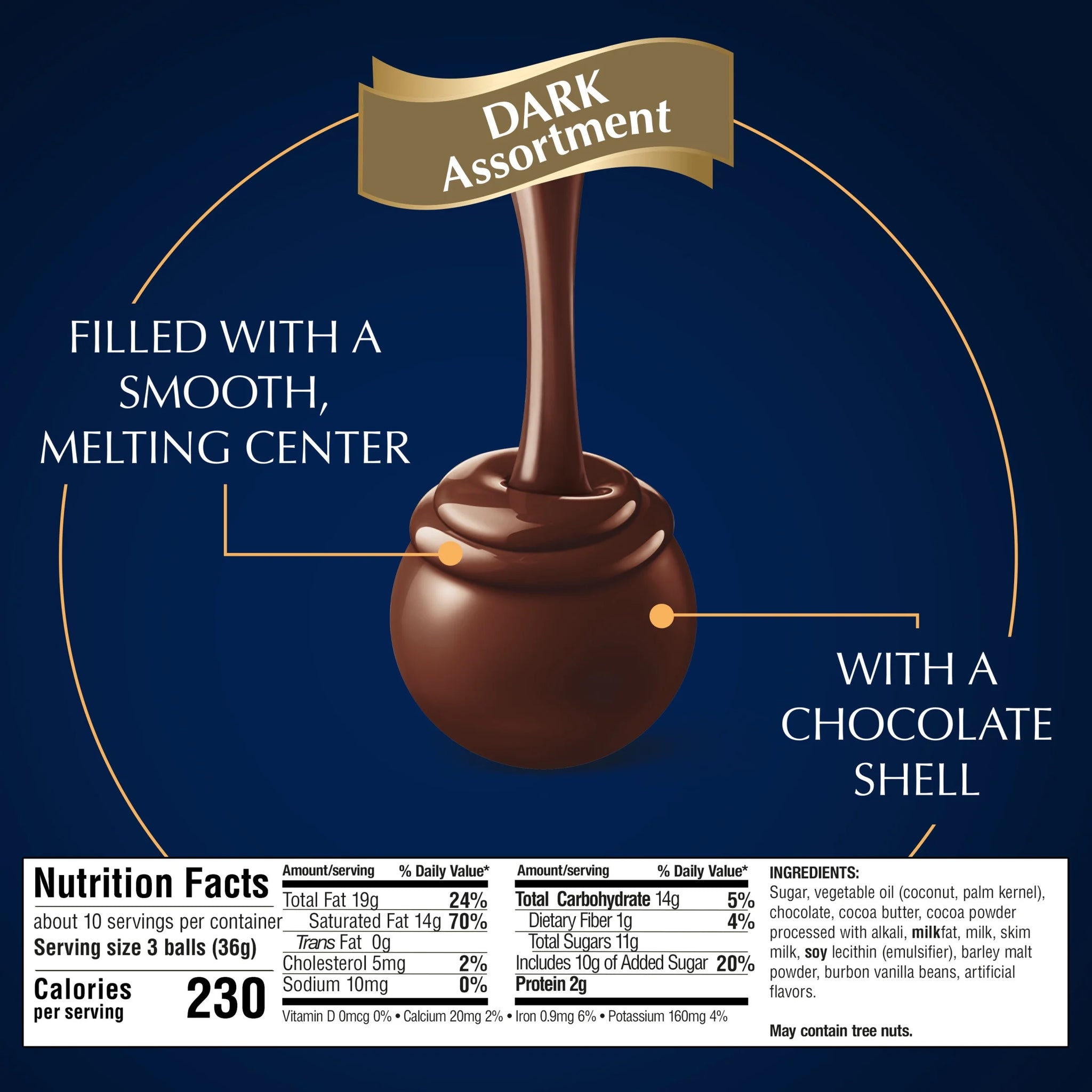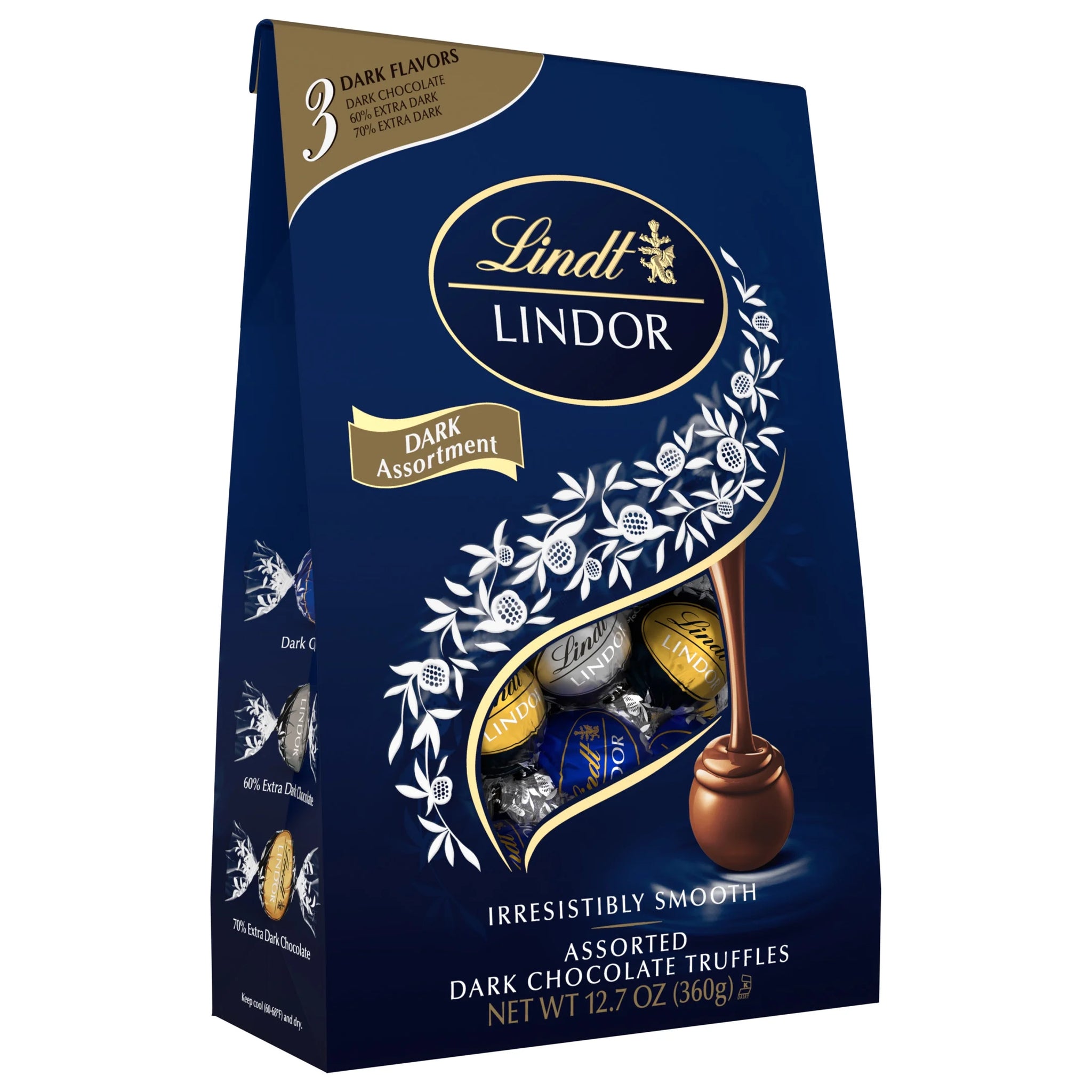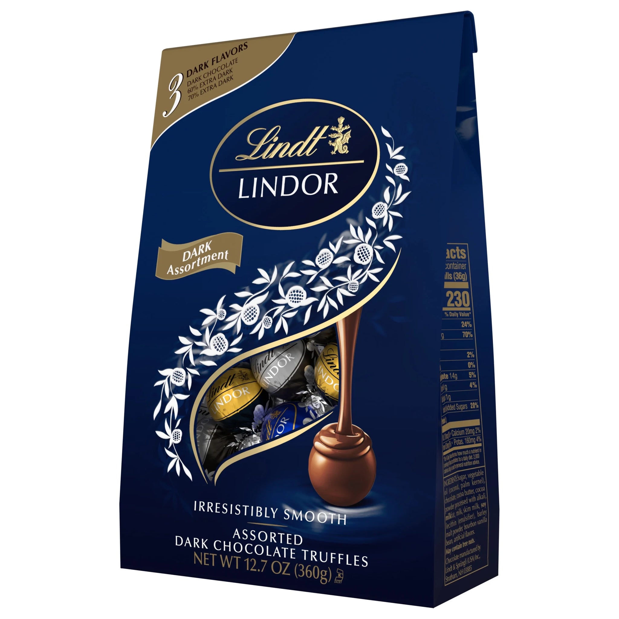 Experience indulgent dark chocolate three ways with Lindt LINDOR Assorted Dark Chocolate Truffles. Surprise the dark chocolate fans in your life with an assorted chocolate candy gift or share a piece of Lindt LINDOR chocolate as an indulgent after-dinner treat. Each bag features Dark Chocolate, 60% Extra Dark Chocolate and 70% Extra Dark Chocolate truffles, so there's something for everyone. Delicate and indulgent, the chocolate shell on every truffle perfectly surrounds the smooth dark truffle filling, which starts melting as soon as you break the shell. These individually wrapped dark chocolate candy truffles are the perfect size to enjoy anytime, anywhere. Lindt chocolate embodies the passion and expert craftsmanship of Lindt Master Chocolatiers for a luscious and rewarding chocolate experience. *Information not complete; check label of actual product being purchased.*