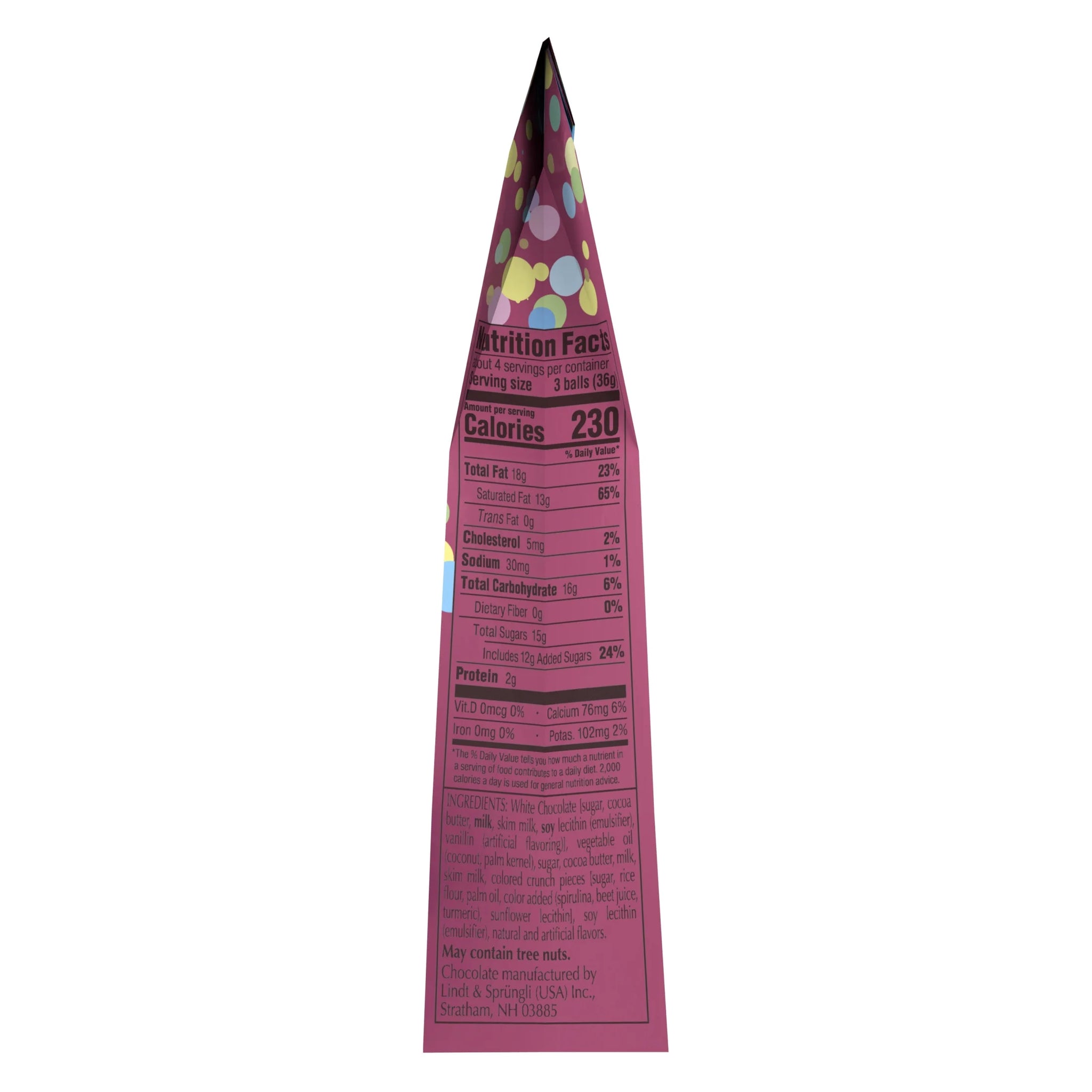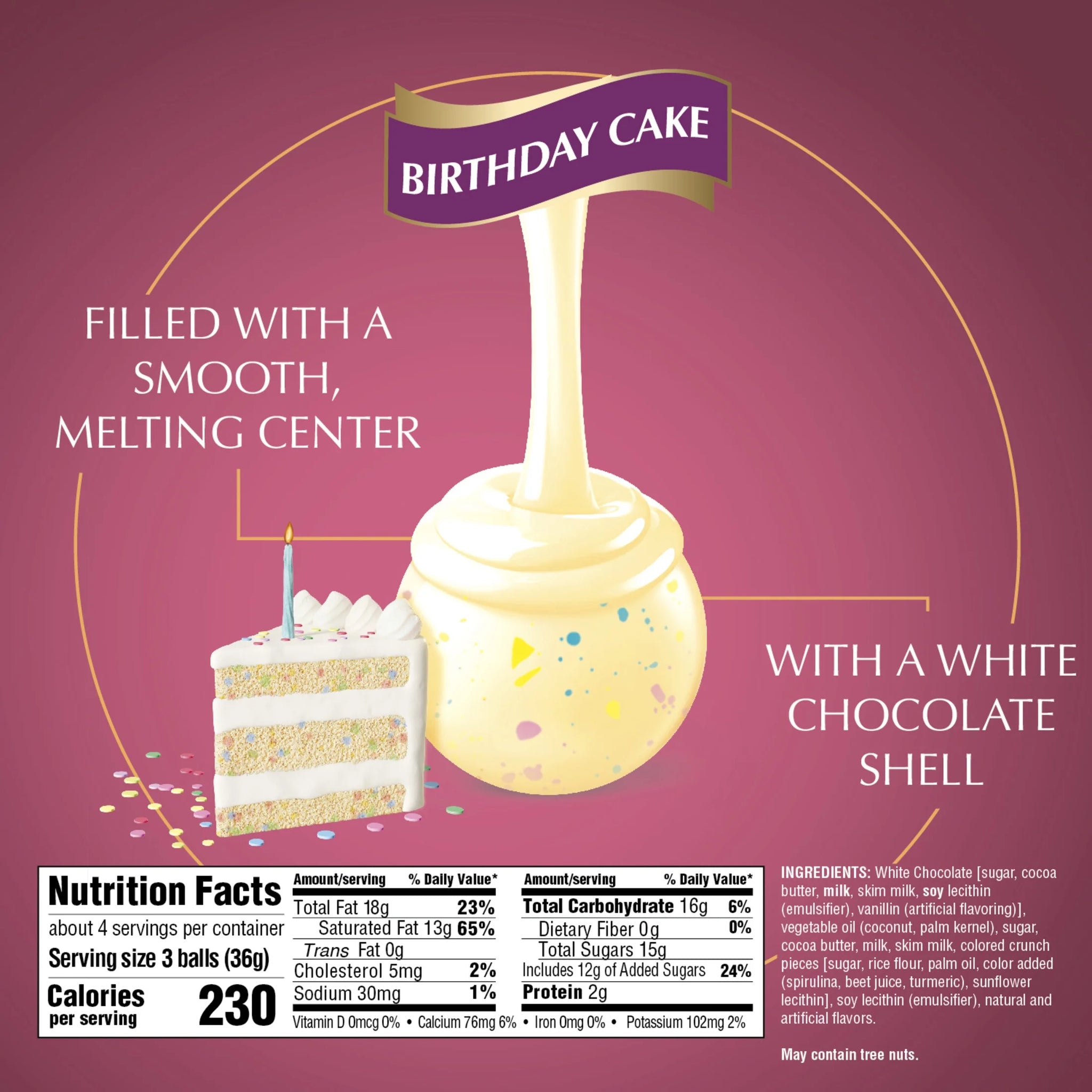 Experience smooth, melting indulgence with Lindt LINDOR Birthday Cake White Chocolate Truffles. These delicious white chocolate candy truffles make every day a special occasion, whether you’re taking a moment to yourself or sharing with friends and family. Finely crafted with a delicate white chocolate shell, these Lindt LINDOR truffles are filled with an irresistibly smooth birthday cake flavored truffle center for the ultimate chocolate experience. These individually wrapped chocolate candies are the perfect size to enjoy anytime, anywhere. Lindt chocolate embodies the passion and expert craftsmanship of Lindt Master Chocolatiers for a rewarding chocolate experience. Made to Melt You. Anytime. Anywhere. In addition to White Chocolate Truffles with Birthday Cake Flavor, LINDOR Truffles are also in an array of other irresistible flavors, including dark chocolate, white chocolate, hazelnut, caramel and more. *Information not complete; check label of actual product being purchased.*