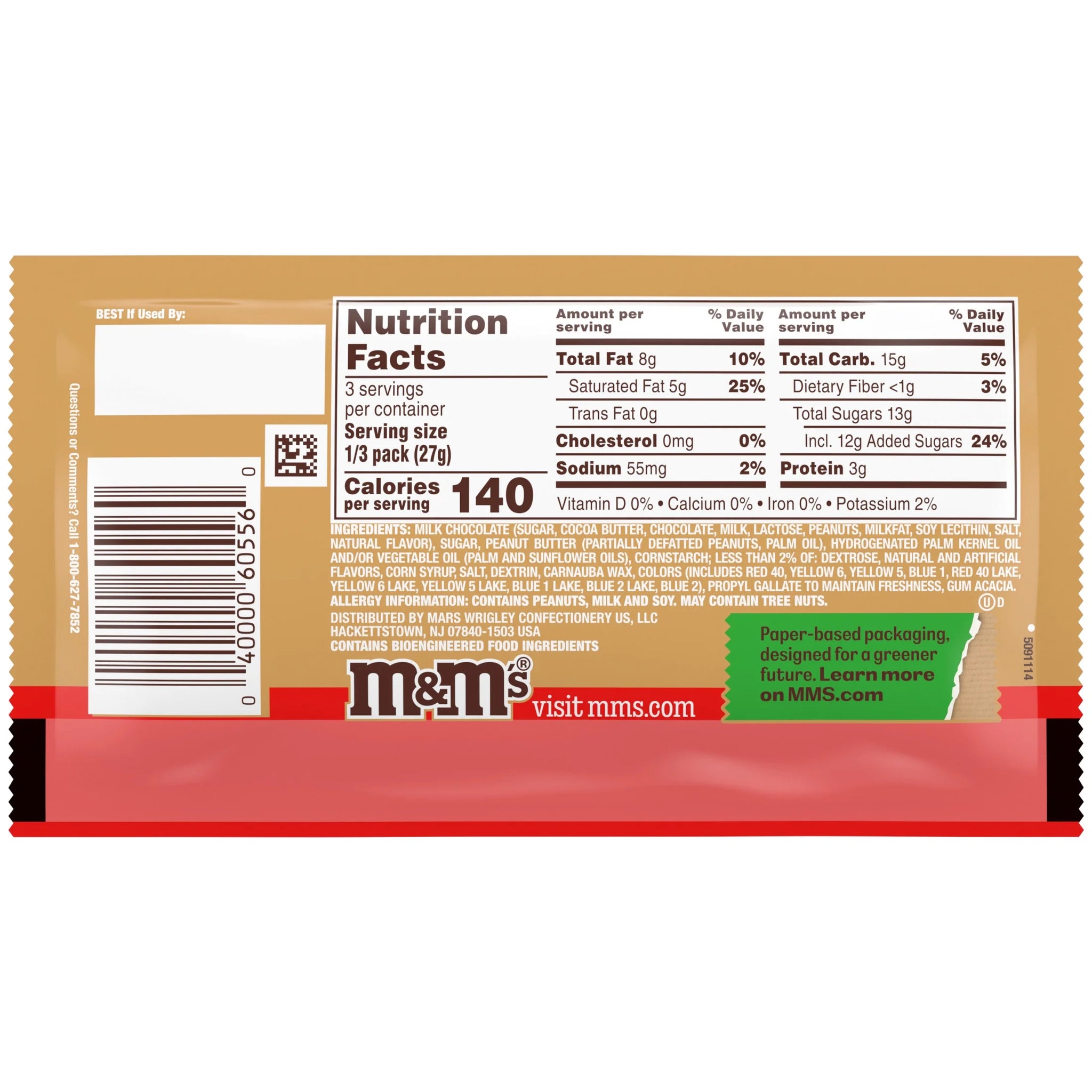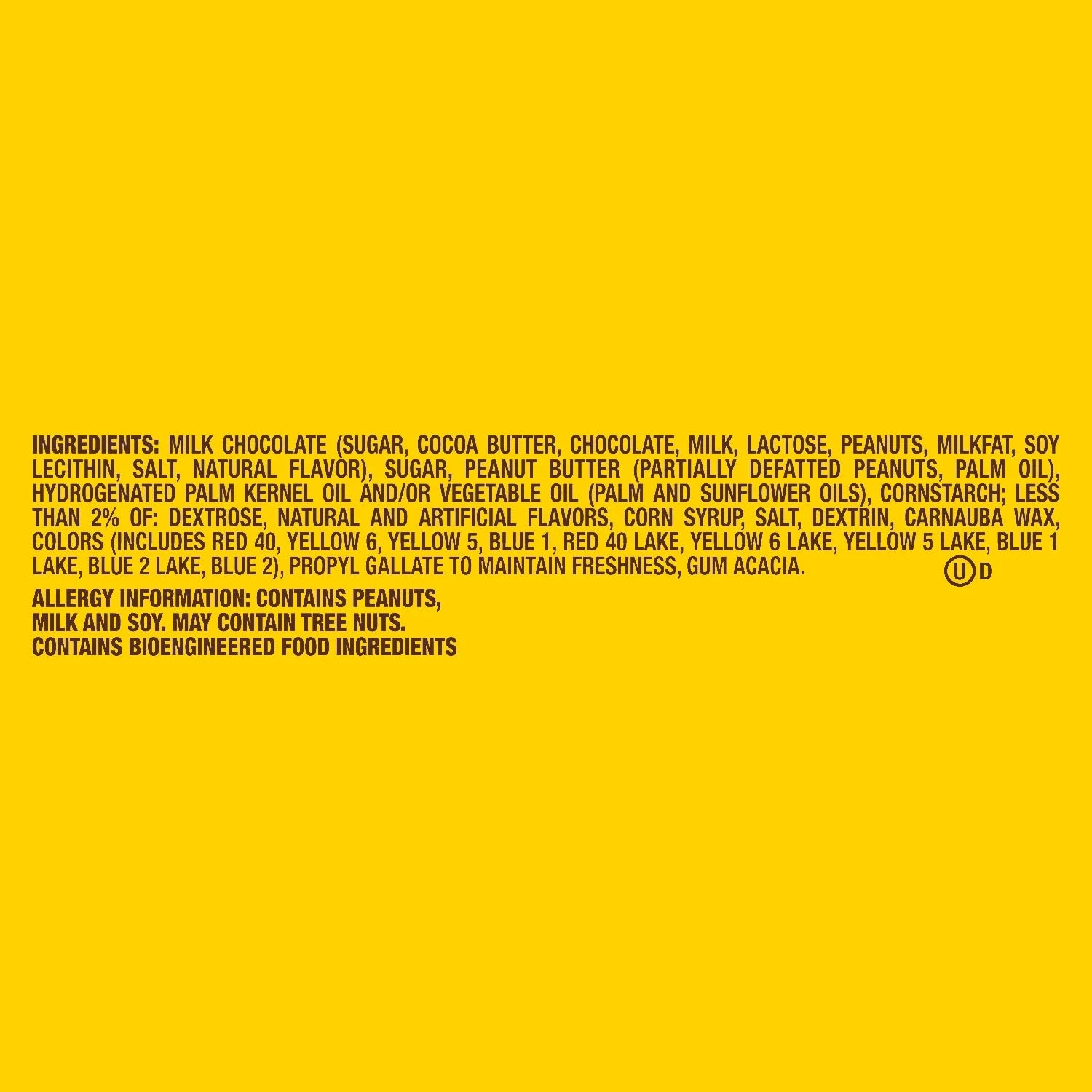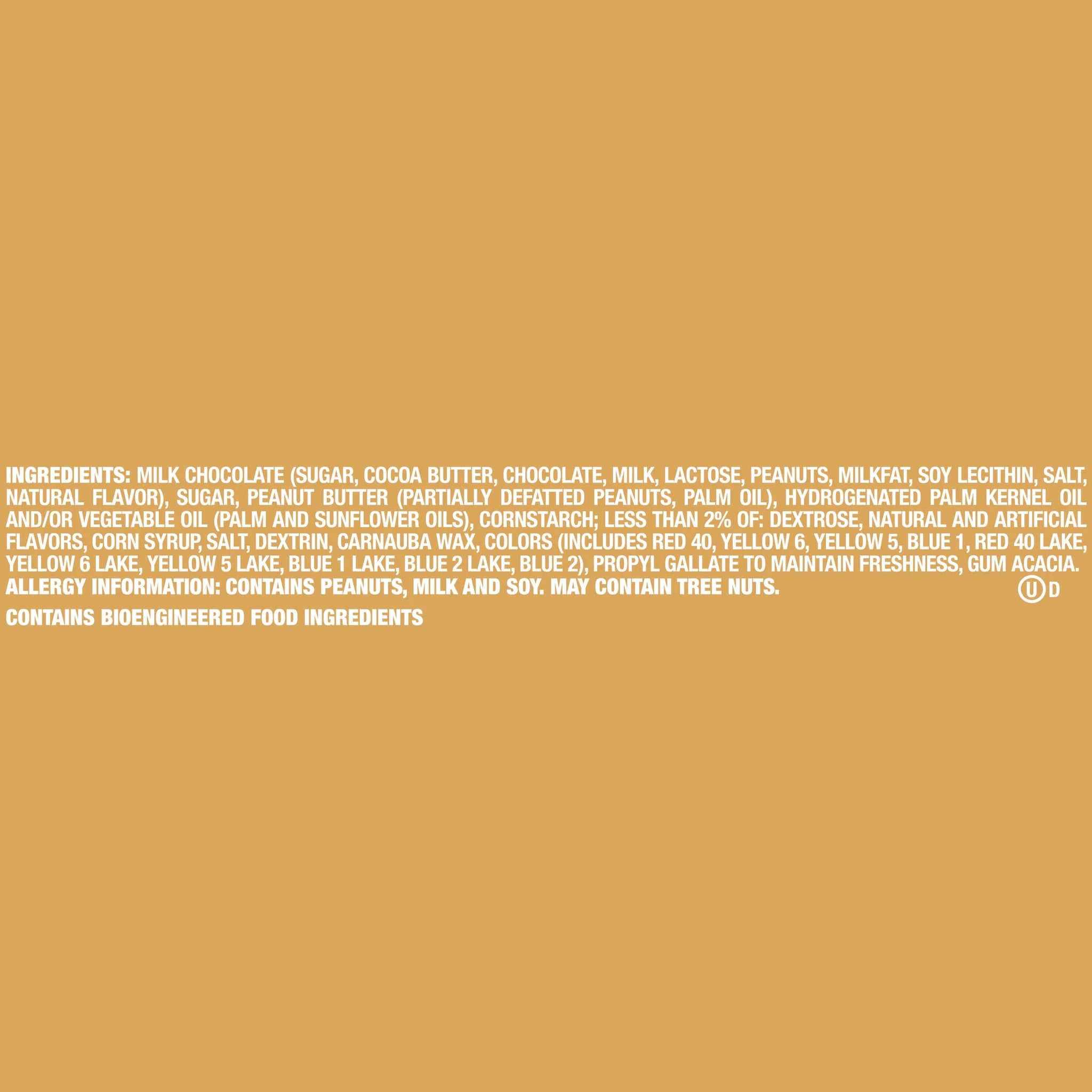 MILK CHOCOLATE (SUGAR, COCOA BUTTER, CHOCOLATE, MILK, LACTOSE, PEANUTS, MILKFAT, SOY LECITHIN, SALT, NATURAL FLAVOR), SUGAR, PEANUT BUTTER (PARTIALLY DEFATTED PEANUTS, PALM OIL), HYDROGENATED PALM KERNEL OIL AND/OR VEGETABLE OIL (PALM AND SUNFLOWER OILS), CORNSTARCH; LESS THAN 2% OF: DEXTROSE, NATURAL AND ARTIFICIAL FLAVORS, CORN SYRUP, SALT, DEXTRIN, CARNAUBA WAX, COLORS (INCLUDES RED 40, YELLOW 6, YELLOW 5, BLUE 1, RED 40 LAKE, YELLOW 6 LAKE, YELLOW 5 LAKE, BLUE 1 LAKE, BLUE 2 LAKE, BLUE 2), PROPYL GALLATE TO MAINTAIN FRESHNESS, GUM ACACIA./div>